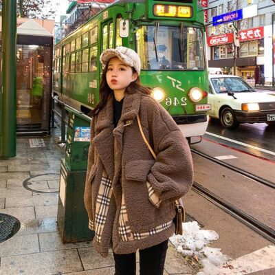 Áo Khoác Len Cừu Nữ 2022 Mới Thu Đông Phong Cách Hàn Quốc Áo Khoác Len Dày Dặn Dáng Ngắn Thịt Cừu Nhung Quần Áo Độn Triều
