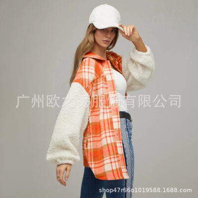 2023 nhà ga độc lập Áo khoác kẻ sọc chặn màu theo phong cách nóng bỏng mới của Amazon mùa thu và mùa đông dày dặn kẻ sọc khâu áo khoác len cừu