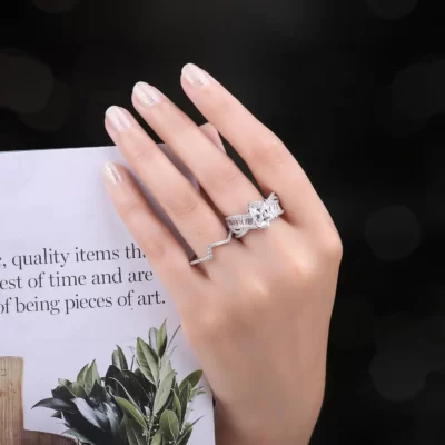 MỚI Tinh Tế Công Chúa Baguette Full Kim Cương Nhẫn Đôi Nhẫn Cặp Hoa Hồng Vàng Vàng Dành Cho Nữ Hình Học Pha Lê Lễ Tình Nhân Trang Sức
