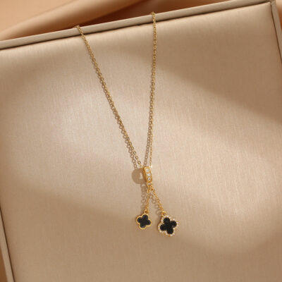 Wen Jian thời trang và thanh lịch bằng thép titan vòng cổ cỏ bốn lá nữ khảm zircon tua cỏ bốn lá mặt dây chuyền quyến rũ dây chuyền xương đòn