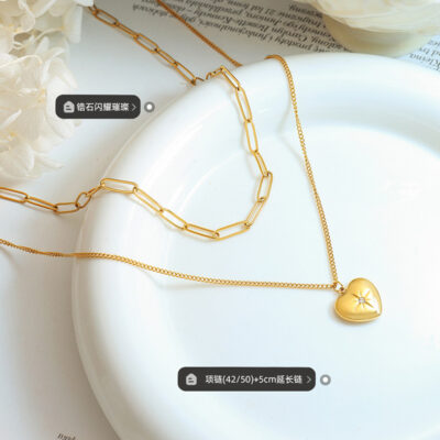 Trang sức châu Âu và Mỹ hai lớp hình trái tim mans ngôi sao khảm zircon mặt dây chuyền vòng cổ titan thép mạ vàng 18k ánh sáng sang trọng trang sức phong cách ins