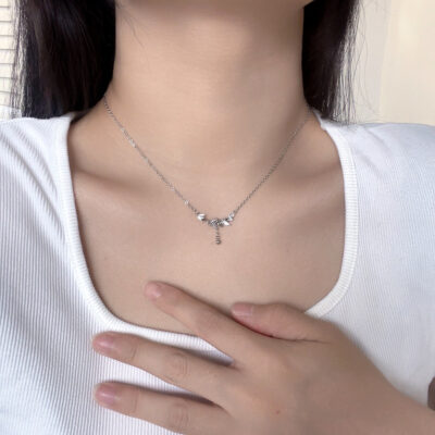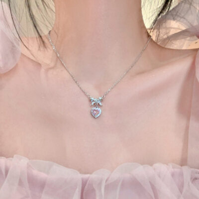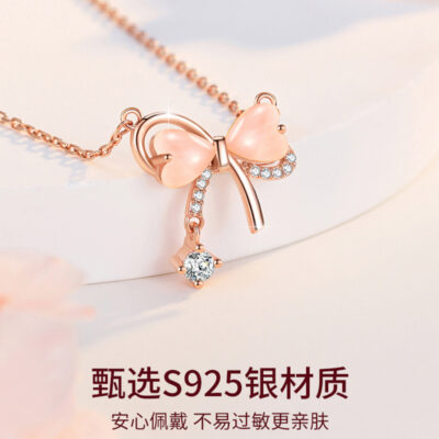 Công Chúa Nút Thắt Vòng Cổ Tình Yêu Nữ Bạc S999 Ánh Sáng Sang Trọng Ngọt Nơ Thắt Nơ Xương Đòn Dây Chuyền Zircon Màu Hồng Mặt Dây Chuyền