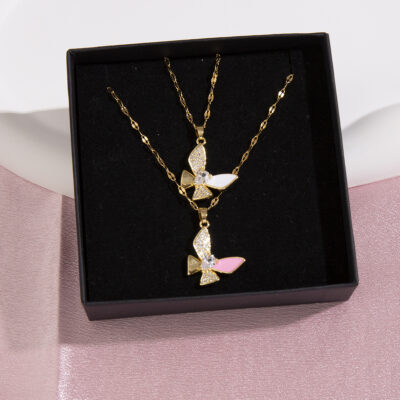Y2k Đồng Thau Mạ Vàng Thật Nữ Vòng Cổ Bướm Ánh Sáng Sang Trọng Zircon Thép Titan Dây Chuyền Nhỏ Giọt Dầu Vòng Cổ Bảo Quản Màu Trang Sức