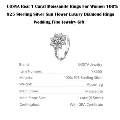 COSYA Thật 1 Carat Moissanite Cho Nữ, Nhẫn Nữ 100% Bạc 925 Hoa Mặt Trời Cao Cấp Nhẫn Đứng Kim Cương Cưới Mỹ Món Quà Trang Sức