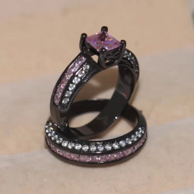 Vintage Hồng Nhẫn Đứng Kim Cương Bộ 10KT Đen Vàng Lấp Đầy Cưới, Ban Nhạc Cho Nữ, Nhẫn Nữ Cô Dâu Bộ LỜI HỨA Trang Sức Dự Tiệc