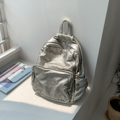 Ba lô da màu bạc đã qua giặt sạch Ba lô nữ đi học kiểu ins Ba lô Hàn Quốc niche 2023 Ba lô nữ