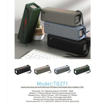 防水蓝牙音箱外便携蓝牙插卡音响TG271迷你运动低音炮,澎湃低音,采用45MM外部无源辐射器展现出扬声器内在的澎湃动力,聆听,感受并见证低音,无惧雨水浸袭,音乐通话,一键切换。供电方式: 内置锂电池功能: 大功率大喇叭、重低音立体声。具有免提功能,可以进行无线传输范围:10M音频性噪比:≥90db电池容量: 2400mAh内置电压:3.7V正常音量播放:6H喇叭规格:¢45mm 喇叭功率:4Ω/5W*2频率响应:150HZ-20KHZ尺寸:204mm *71mm*62mm单机重量:558g外箱尺寸:45.8*37.2*25包装:30PCS/箱重:20kg.