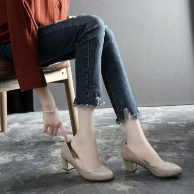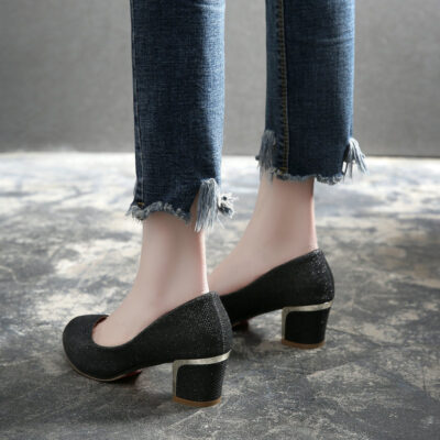 1138-1 giày cao gót nữ dày gót miệng nông kim sa lấp lánh giày đơn nữ gót vừa chất béo bàn chân rộng chất béo giày nữ 41-43