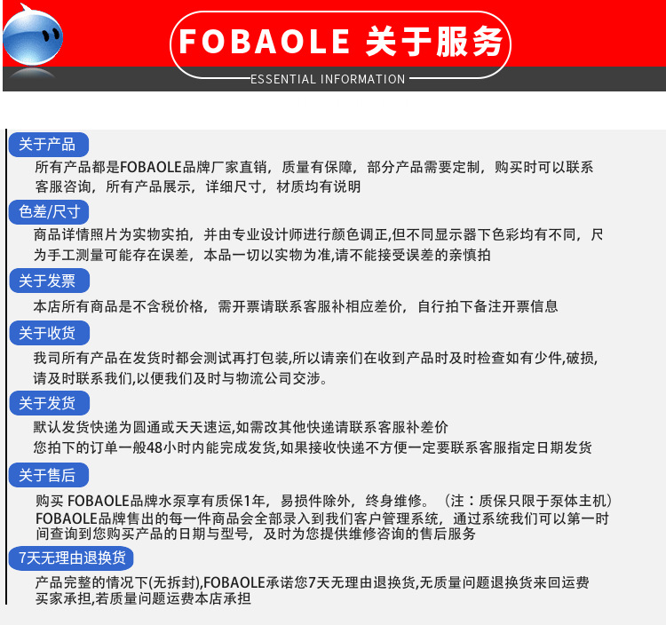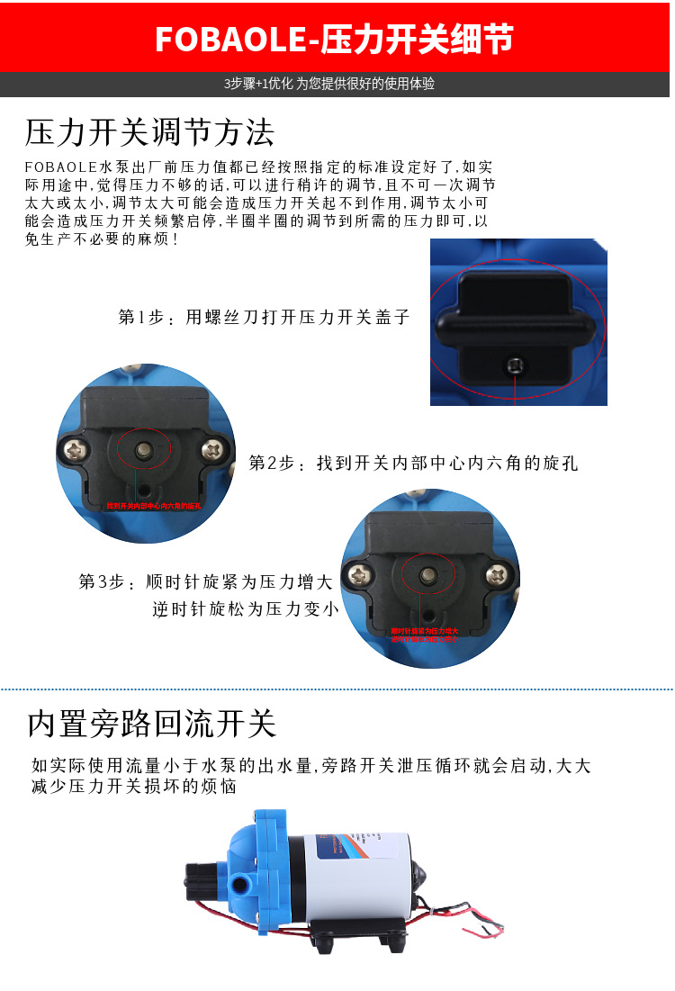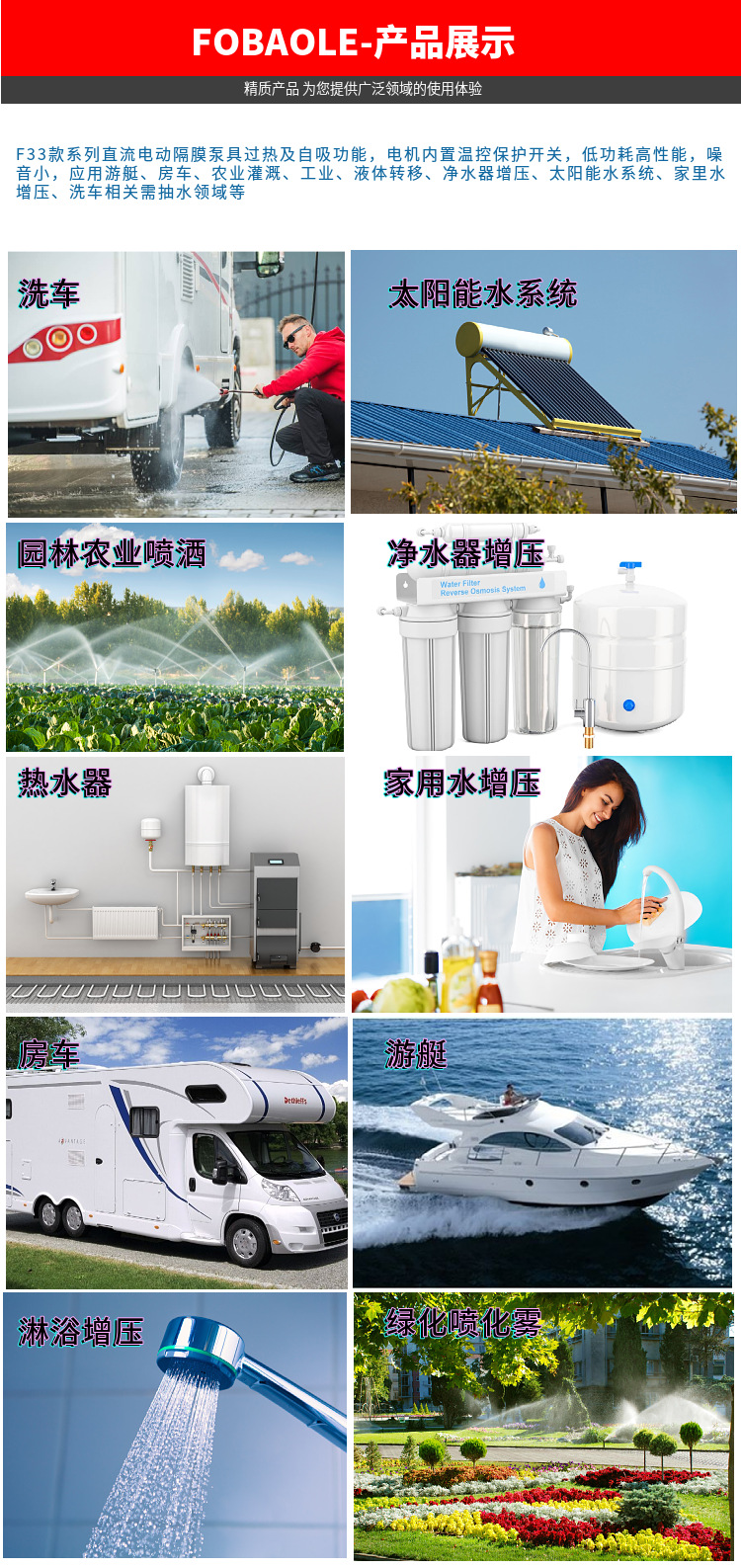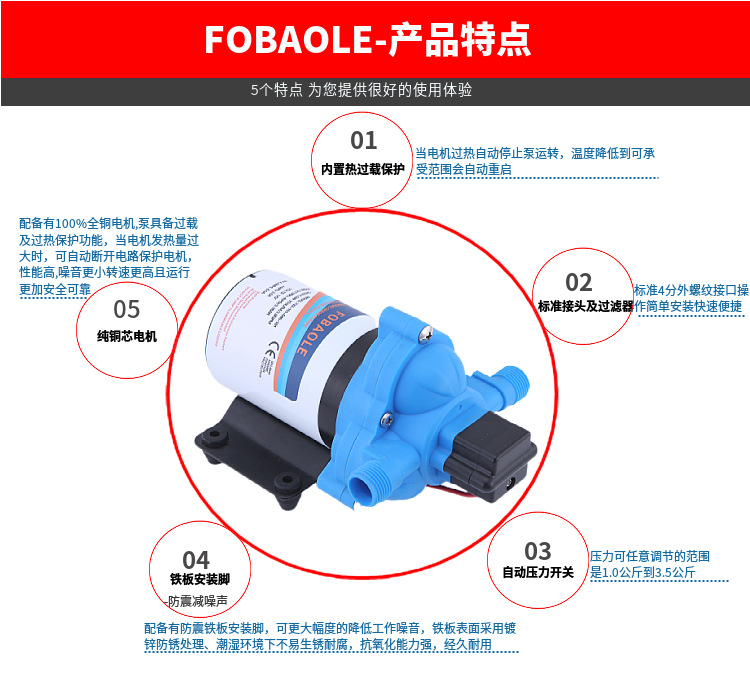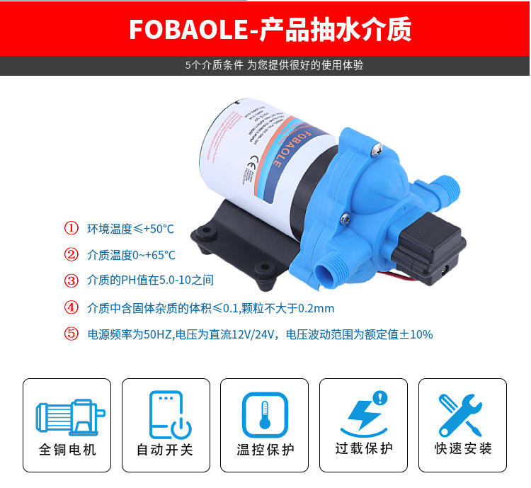 Thương hiệu: FOBAOLE Mã hàng: F33-102-045-A1 Model động cơ:// Công suất định mức: 96W Chất liệu thân bơm: Nhựa kỹ thuật Độ nâng tối đa: 31 mét Số tiêu chuẩn: Kích thước nhập khẩu: 1/2-14 Giao diện ren ngoài được xếp hạng Tốc độ dòng chảy: 11,6 L/phút Trọng lượng: 2,2 KG Null: Phương thức kết nối bảng: ren Tham số bổ sung: Model đặc điểm kỹ thuật: F33-102-045-1011 (12V)/F33-102-045-2011 (24V)/F33-102 – 045-2011 (24V) Cột áp định mức: 31 mét Điện áp: 12V/24V/24V Lưu lượng tối đa: 11,6 L/phút
