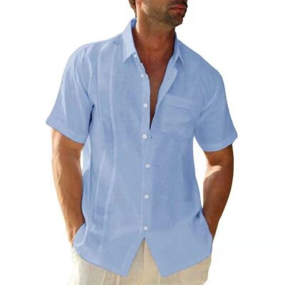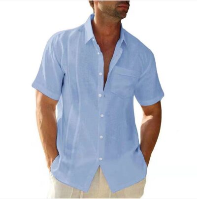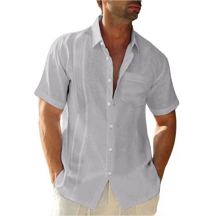 2022 Amazon Mùa Hè Nam Túi Ve Áo Điện Đơn Cardigan Màu Vải Lanh Cotton Ngắn Tay Áo Sơ Mi Nam