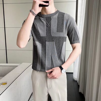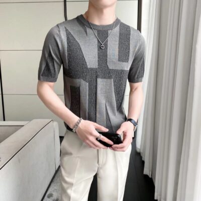2022 Mới Ngắn Tay Nam Áo Len Dệt Kim Tự Tu Thời Trang Thanh Niên Đáy Áo Sơ Mi Nửa Tay Cá Tính Triều Thương Hiệu Hàng Đầu