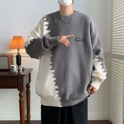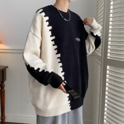 2022 Phối Màu Áo Len Dệt Kim Cổ Tròn Nam Áo Len Dệt Kim Trẻ Trung Rời Áo Len xuất khẩu Phong Cách Hồng Kông Dài Tay Nam