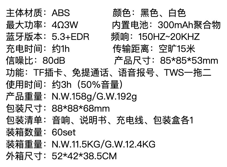 Nguồn điện: Pin lithium là bằng sáng chế Nguồn: Không Cho dù ngoại thương: Có (Sản phẩm này chỉ dành cho mục đích ngoại thương, có thể không đáp ứng các tiêu chuẩn sản phẩm trong nước. Người mua trong nước vui lòng mua cẩn thận.) Màu sắc: Đen / Trắng / Trắng Cho dù chức năng là xuất khẩu xuyên biên giới Nguồn cung cấp độc quyền: Có Loại chứng nhận: ce/FCC/ROHS/ROHS Phiên bản Bluetooth: 5.3 Thương hiệu: Obsessed Số loa: 1 Số mặt hàng: JG2346 Các tình huống áp dụng: máy tính để bàn/nhà/trực tiếp/trực tiếp Kích thước ngoại hình: 85 * 85 * 53 Công suất định mức: 3 Pin tích hợp: Pin tích hợp Chất liệu hộp: nhựa Mức độ chống thấm nước: ipx 1 Các nền tảng hạ nguồn chính: ebay/Amazon/wish/AliExpress/Independent station/LAZADA/LA ZADA Khoảng cách hiệu quả: 10 Khu vực bán hàng chính: Nhật Bản và Hàn Quốc/Châu Phi/Hàn Quốc/Nhật Bản/Châu Âu/Nam Mỹ/Đông Nam Á/Bắc Mỹ/Bắc Mỹ/Đông Bắc Á/Trung Đông/Mỹ Latinh/Châu Âu và Châu Mỹ/Châu Âu và Châu Mỹ SNR: ≥75dB