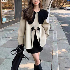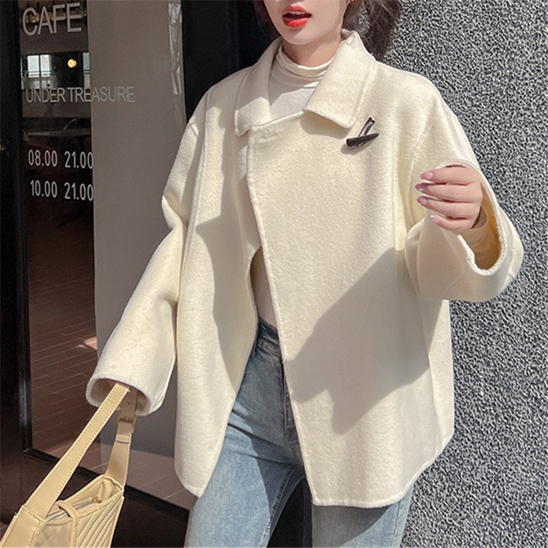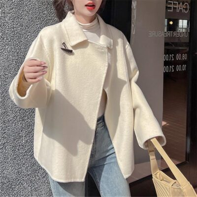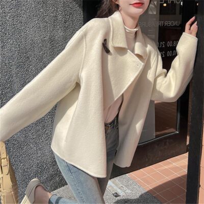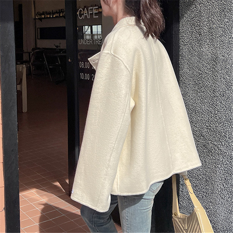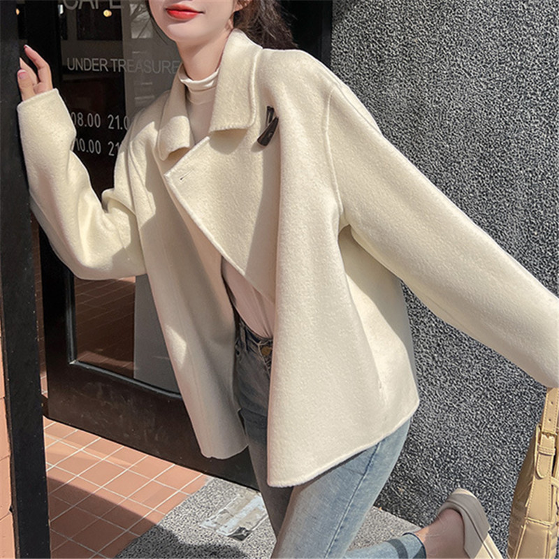 2023 Màu Be 2 Mặt Áo Khoác Len Cashmere Nữ Thu Đông Phần Ngắn Thời Trang Nhỏ Khóa Áo Khoác Len