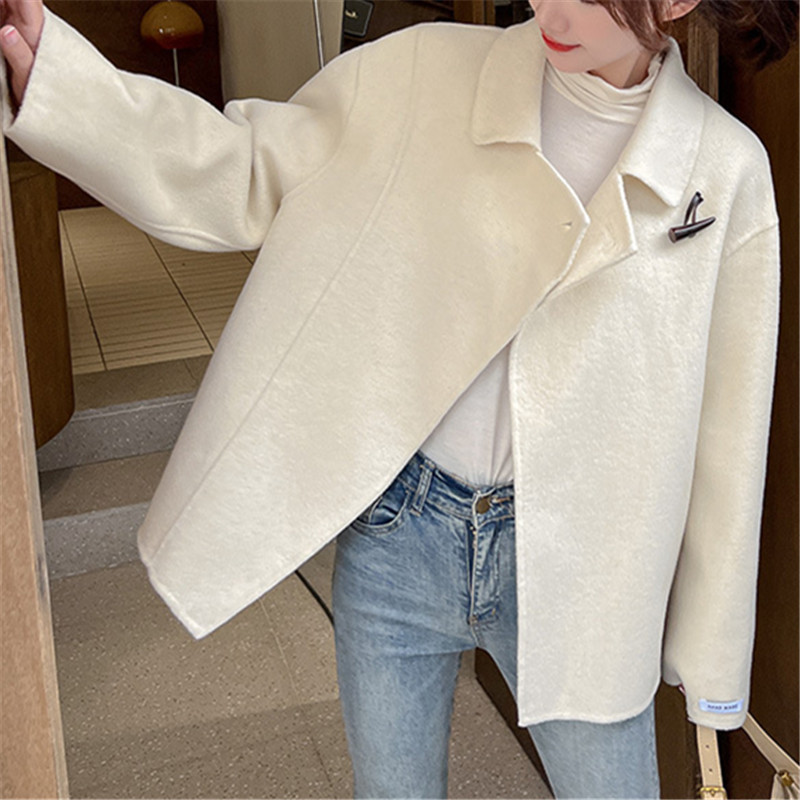 2023 Màu Be 2 Mặt Áo Khoác Len Cashmere Nữ Thu Đông Phần Ngắn Thời Trang Nhỏ Khóa Áo Khoác Len