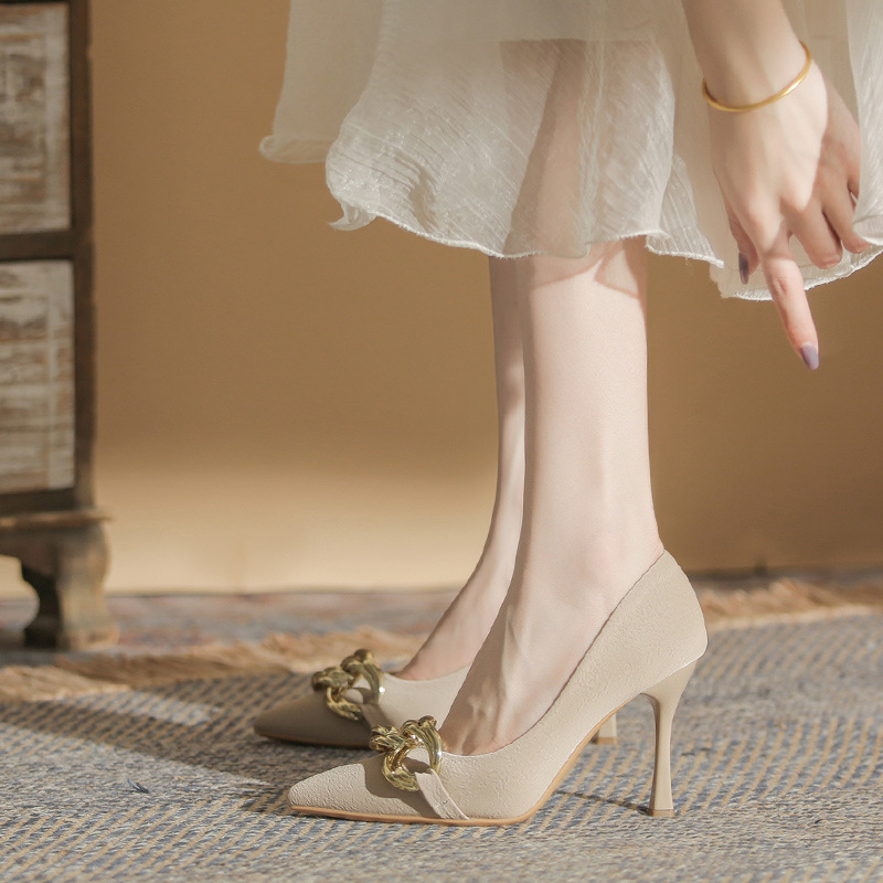 2023 mới khóa kim loại giày nữ xuân thu đơn giày thiết kế cảm giác thích hợp màu nude Pháp giày cao gót đế xuồng nữ