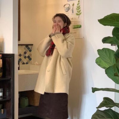 2023 mùa thu đông Hàn Quốc Dongdaemun nhà thiết kế ve áo ngọt ngào đi làm trung dài áo khoác len màu be áo khoác