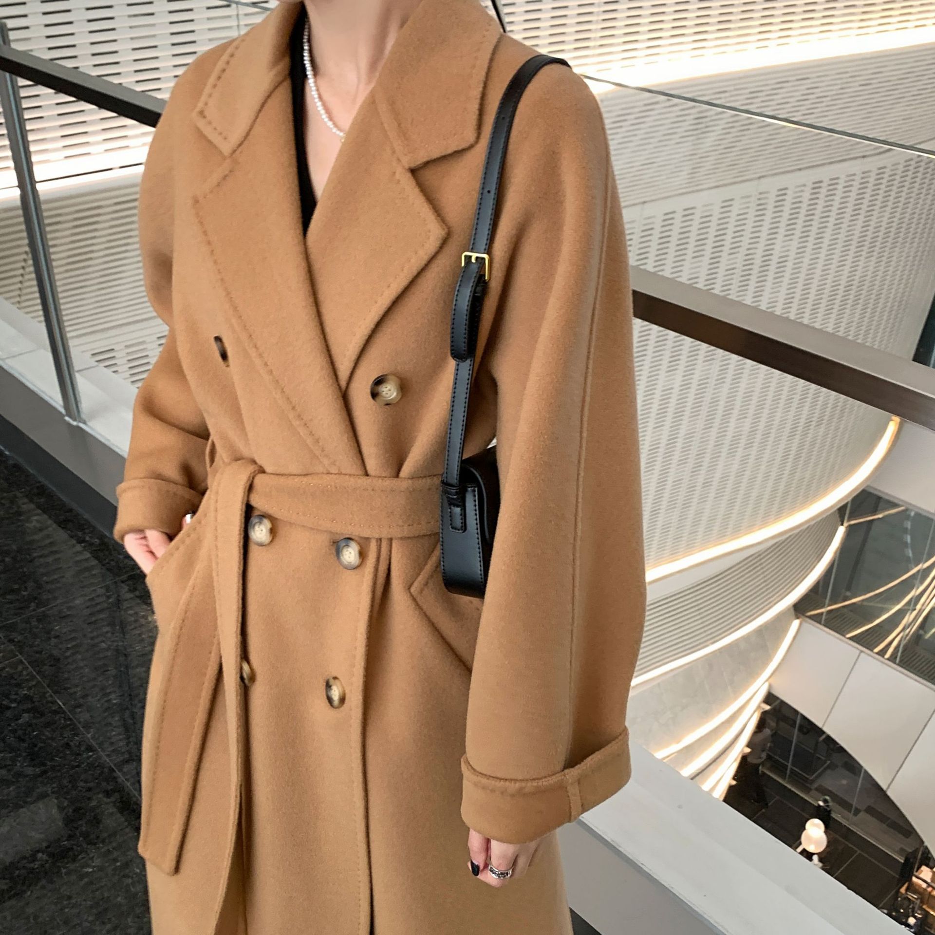 2023 mùa thu đông mới 2 mặt tay phối áo khoác len dáng rộng thanh lịch dài đến đầu gối đôi dài áo khoác nữ