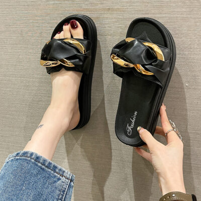 2023 Ngoại Thương Dép Phẳng Mới Áo Khoác Ngoài Mùa Hè Cho Nữ Thời Trang Phong Cách Hàn Quốc Trang Trí Khóa Kim Loại Đáy Dày Xăng Đan Nữ