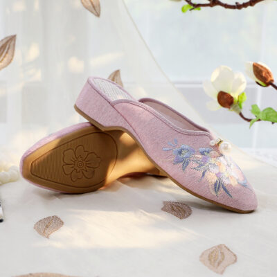 2023 Size Lớn Dép Nữ Mùa Hè Dốc Thấp Gót Đế Dày Thêu Hoa Xăng Đan Nữ Mũi Nhọn Đính Hạt Thời Trang