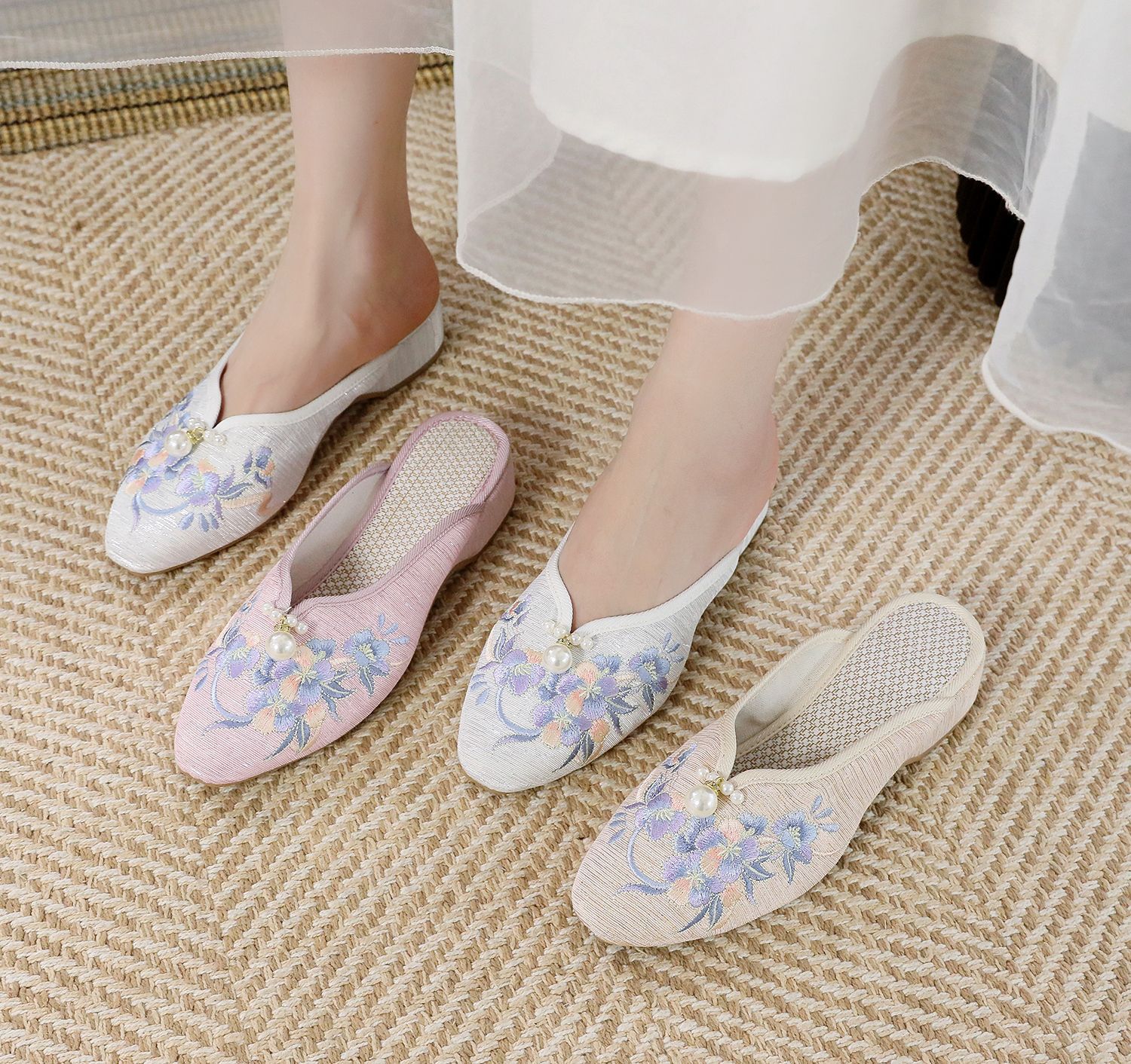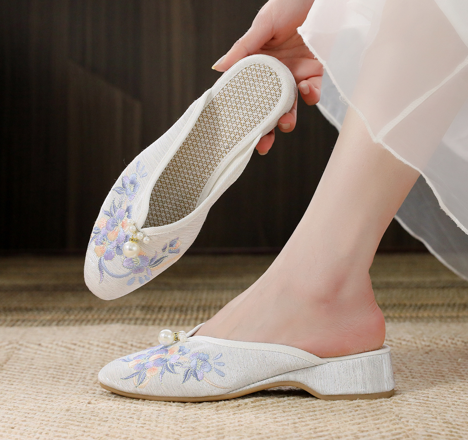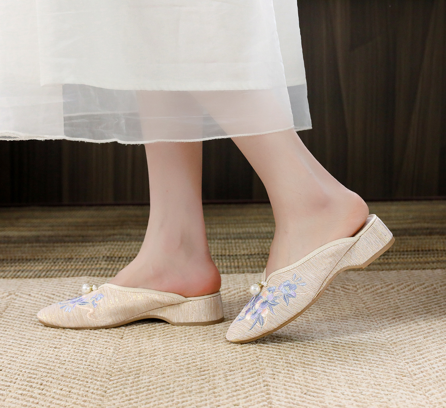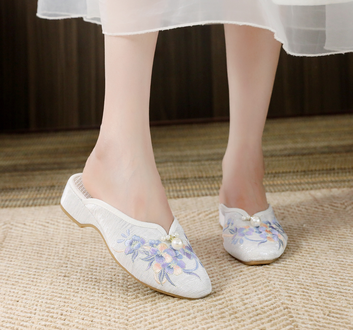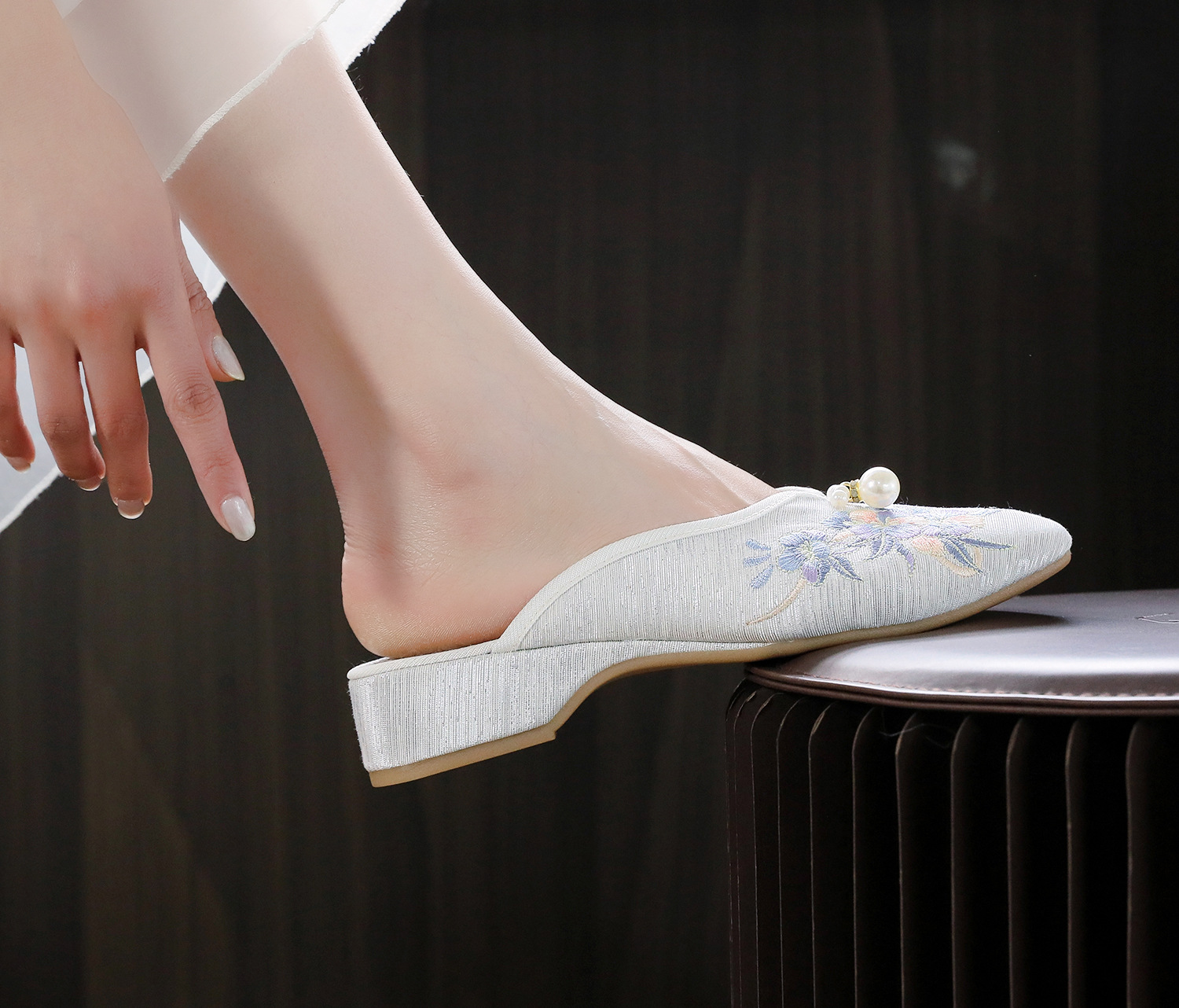 2023 Size Lớn Dép Nữ Mùa Hè Dốc Thấp Gót Đế Dày Thêu Hoa Xăng Đan Nữ Mũi Nhọn Đính Hạt Thời Trang