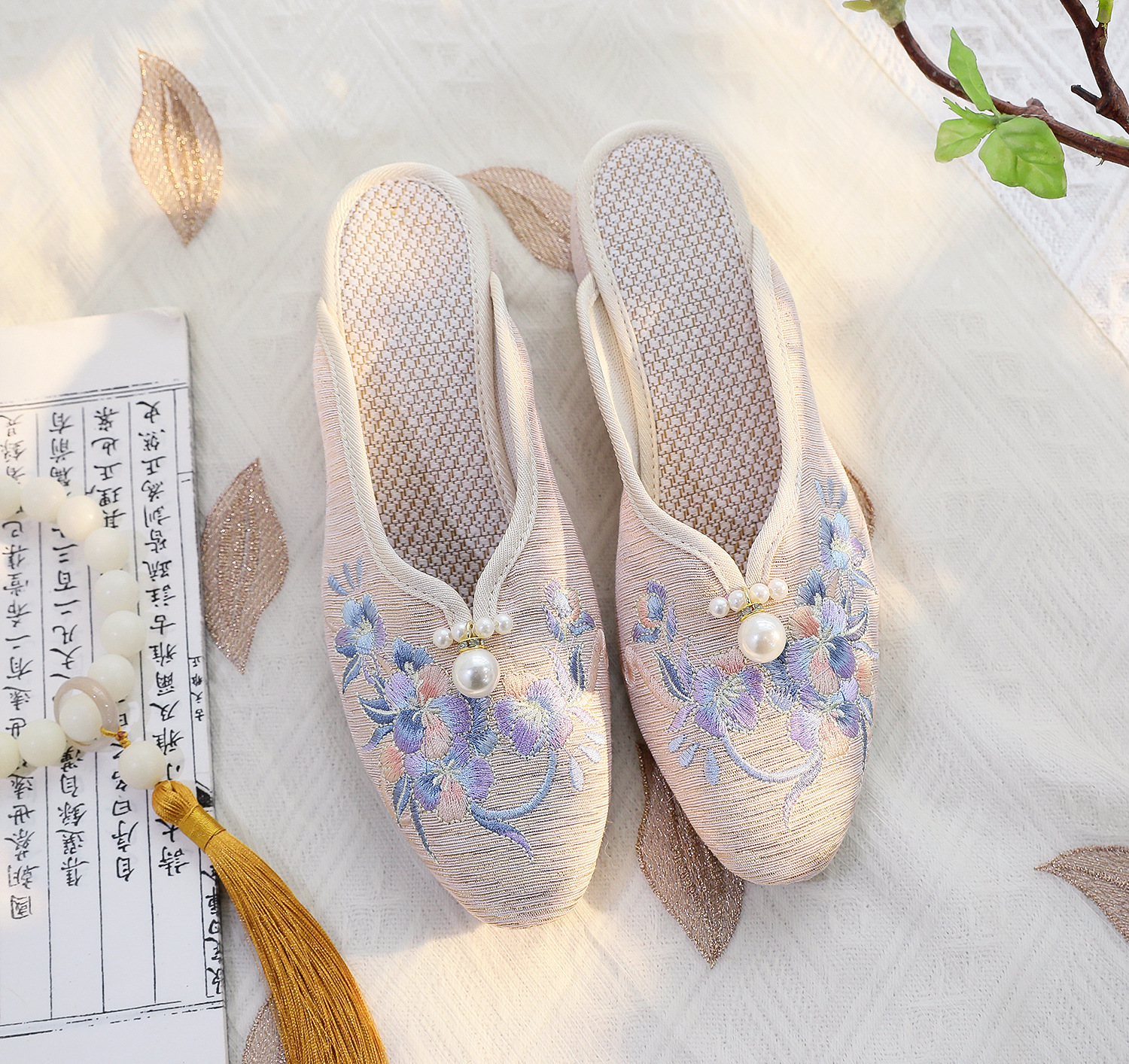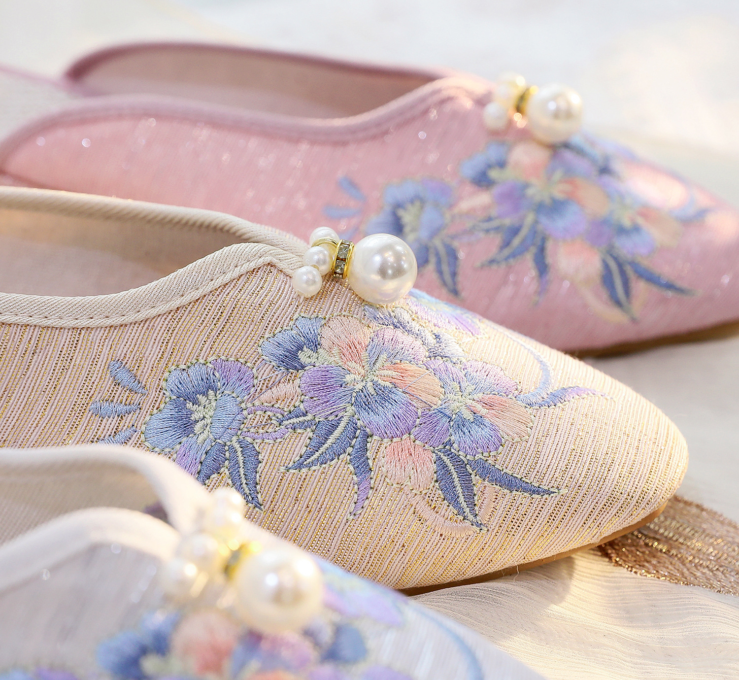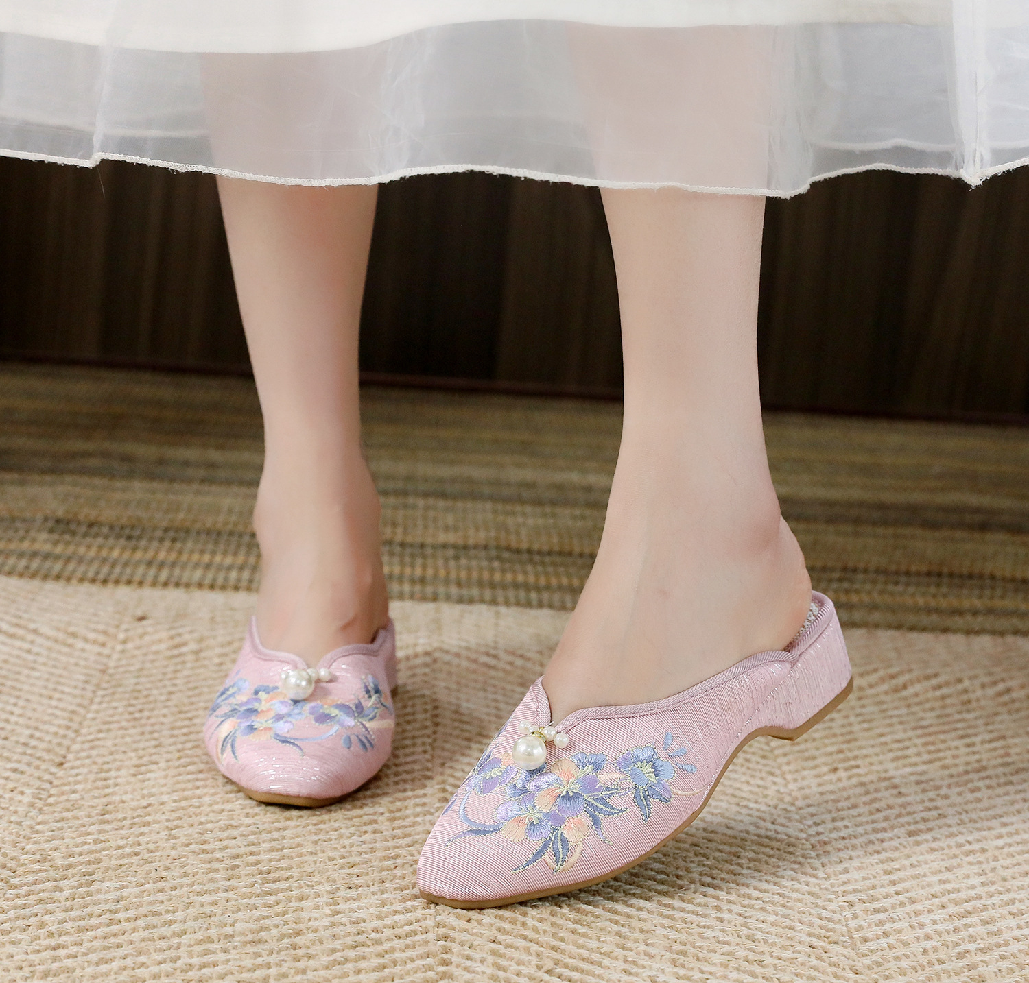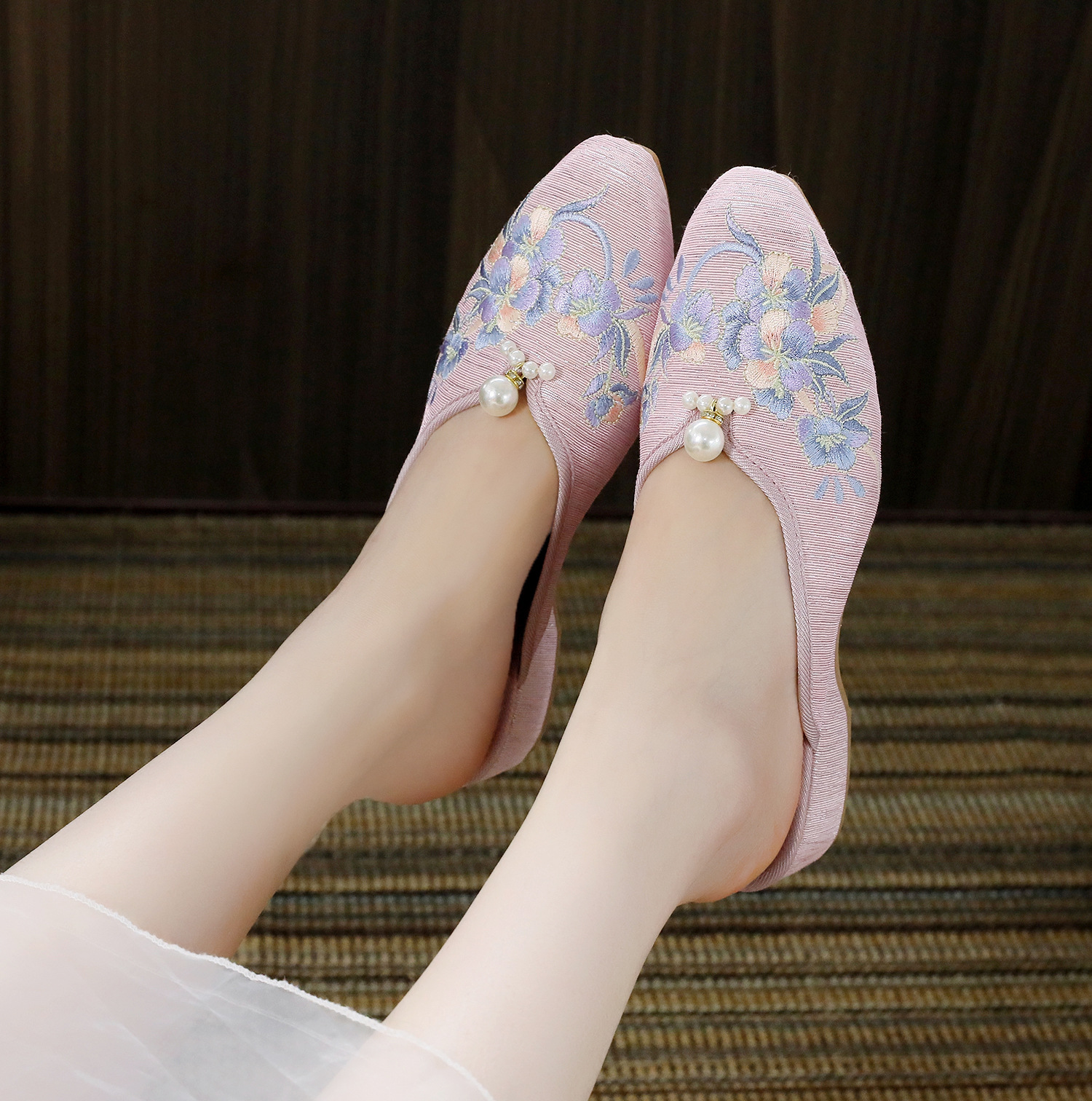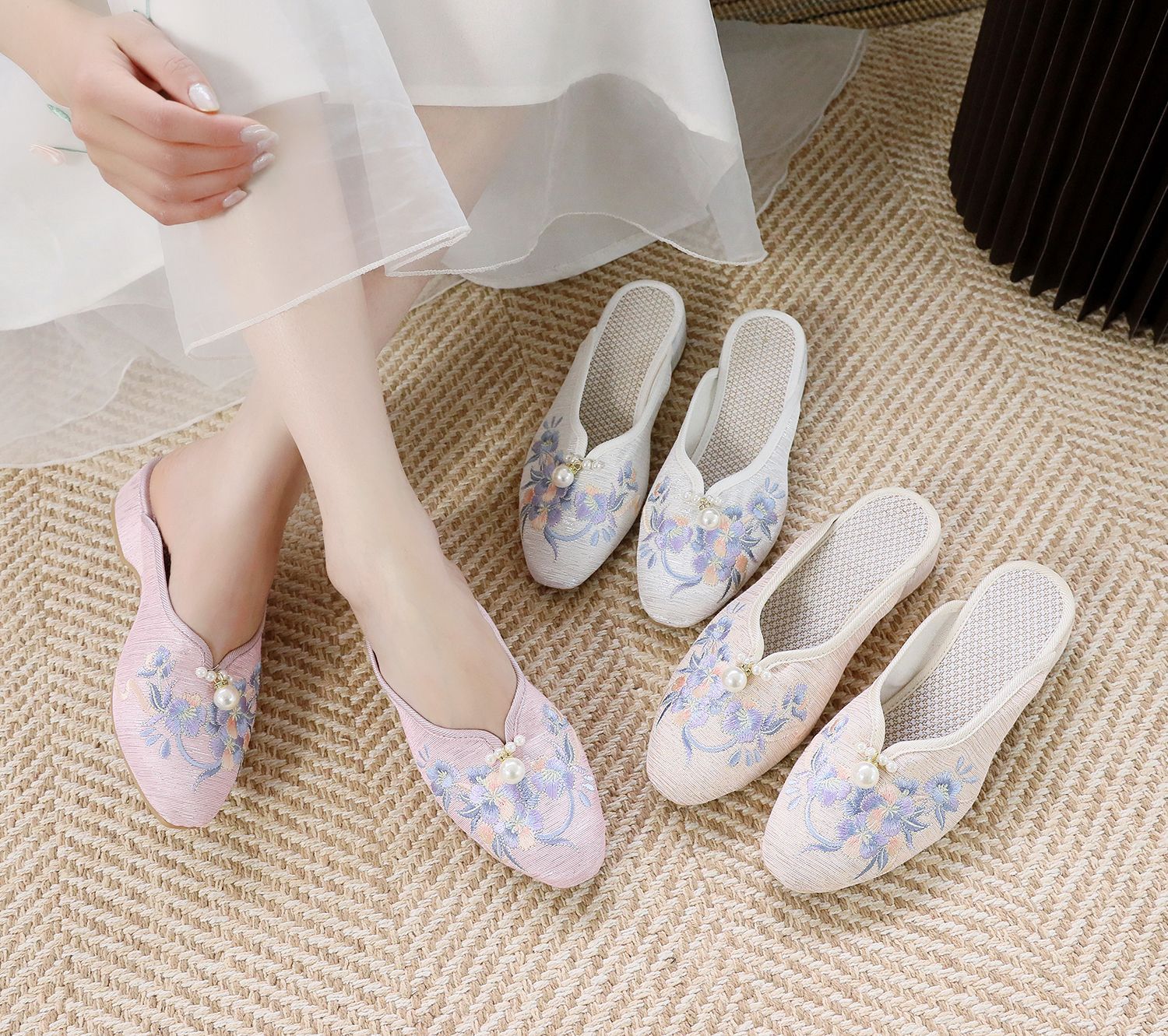 2023 Size Lớn Dép Nữ Mùa Hè Dốc Thấp Gót Đế Dày Thêu Hoa Xăng Đan Nữ Mũi Nhọn Đính Hạt Thời Trang
