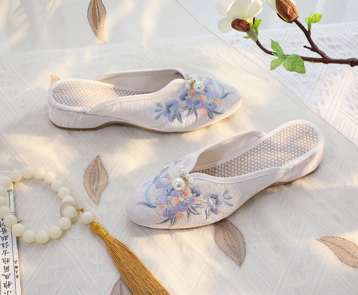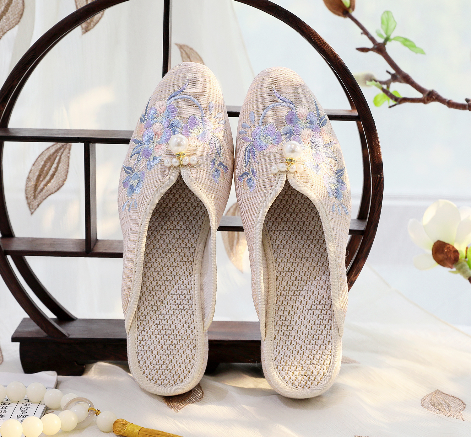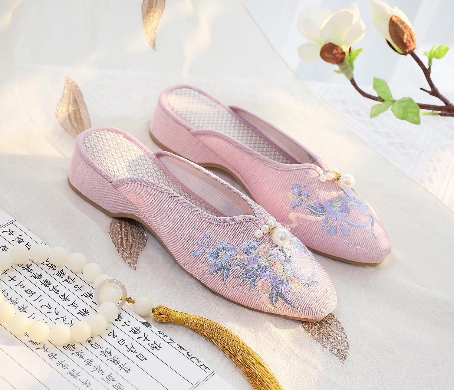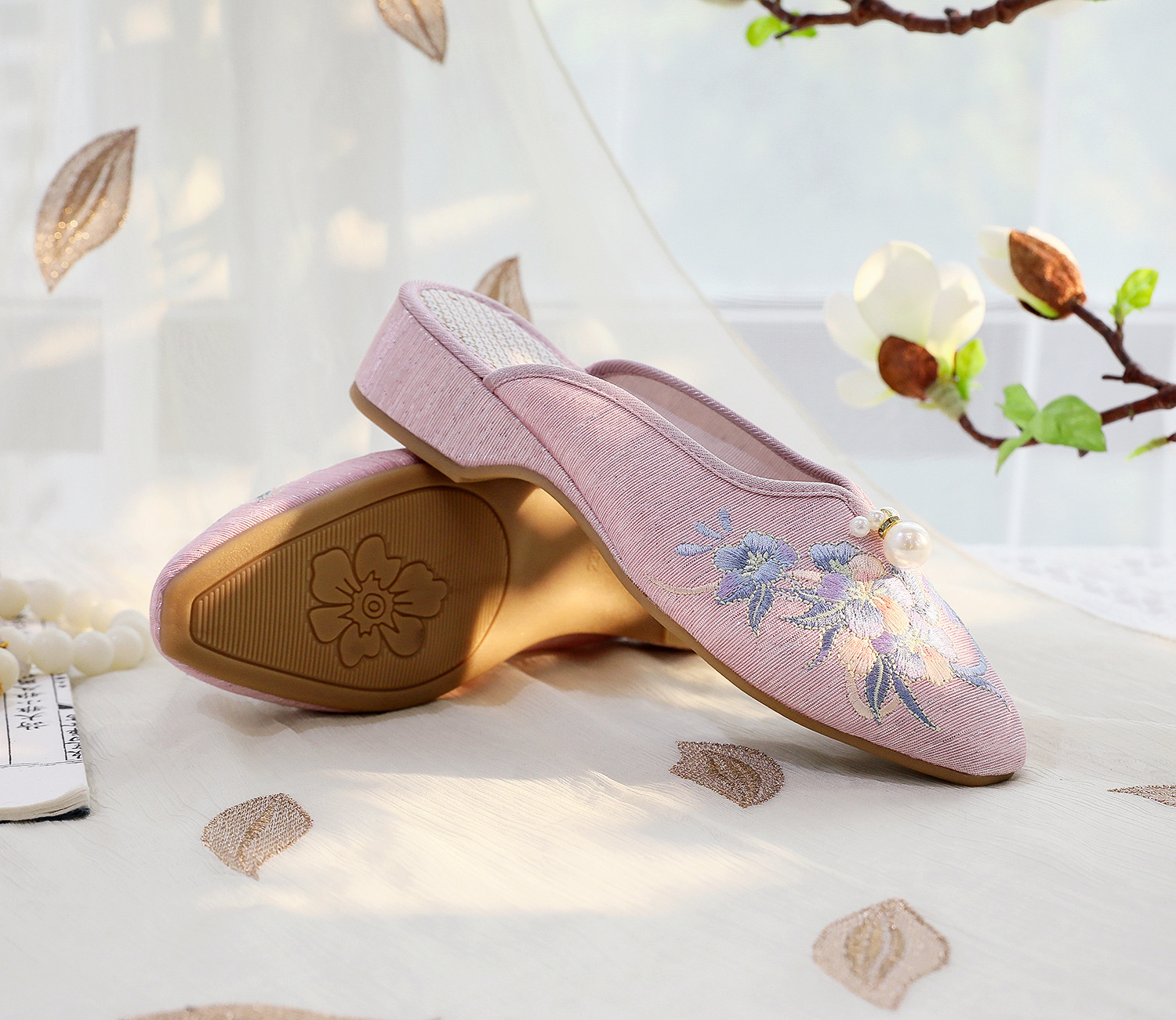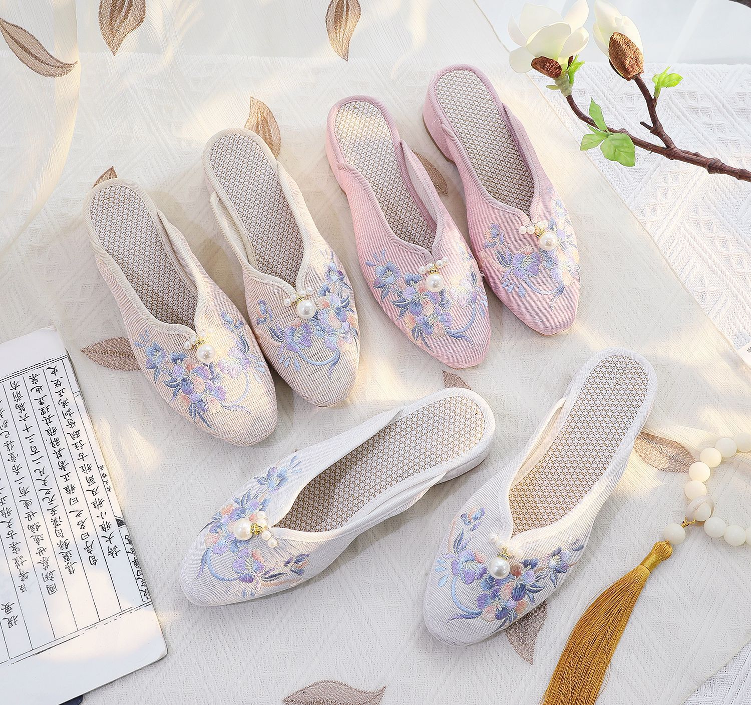 2023 Size Lớn Dép Nữ Mùa Hè Dốc Thấp Gót Đế Dày Thêu Hoa Xăng Đan Nữ Mũi Nhọn Đính Hạt Thời Trang