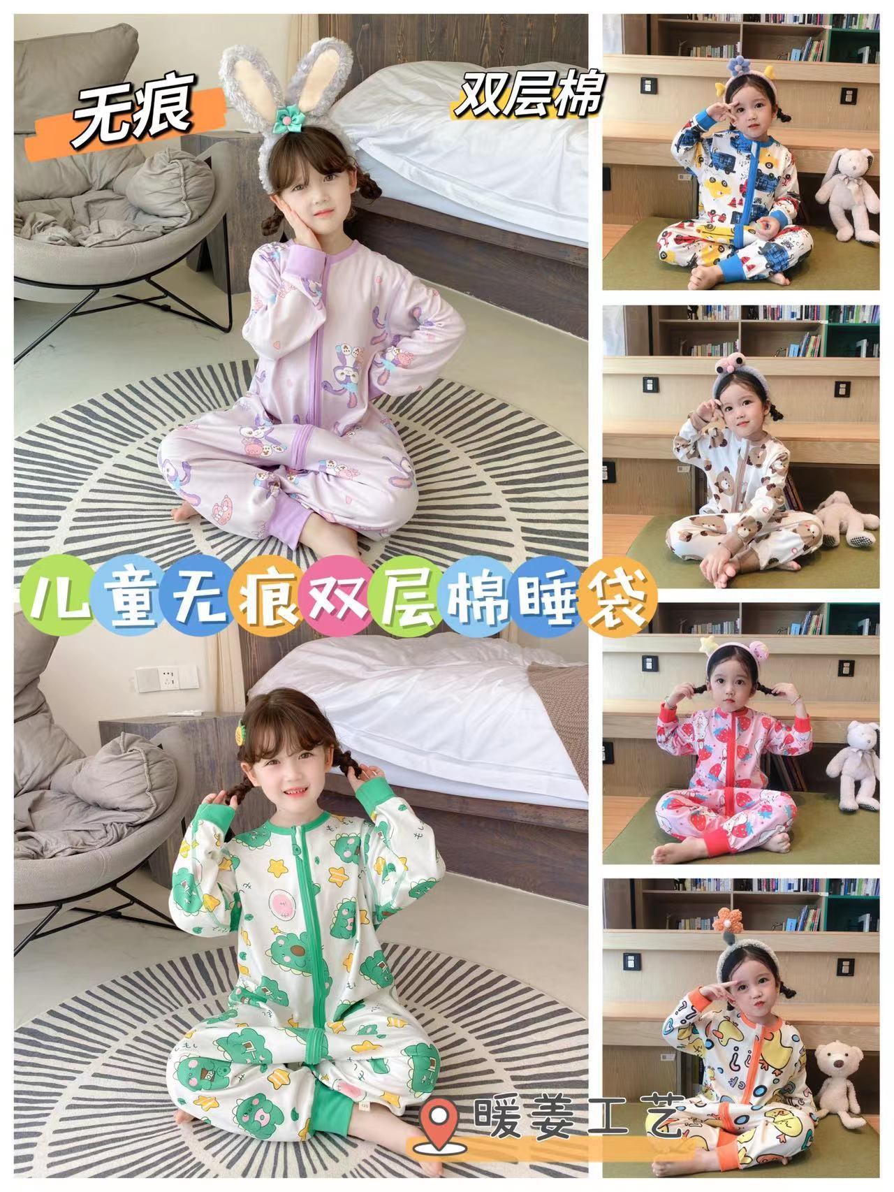 22 túi ngủ dài tay cotton hai lớp hoạt hình liền mạch quần áo leo núi chăn bông chống đá quần áo ở nhà