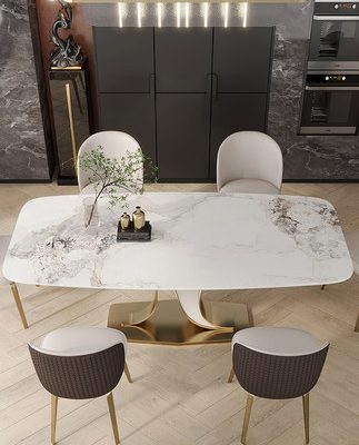 Bàn ăn bằng đá cẩm thạch sang trọng nhẹ Bàn ăn gia đình hình chữ nhật 6 người căn hộ lớn nhà thiết kế bàn ăn bằng thép không gỉ và ghế kết hợp là sản phẩm nổi bật trong dòng bàn ăn nhập khẩu, thiết kế hiện đại và sang trọng, phù hợp với nhiều không gian nội thất cao cấp.