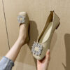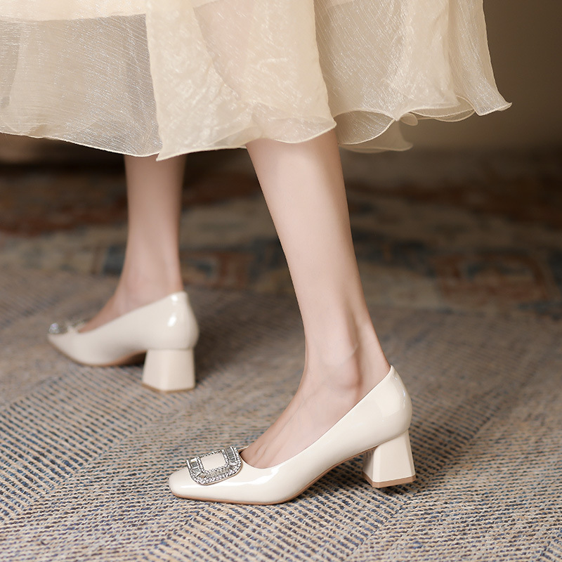 5288-9 Giày Mary Jane nữ mũi vuông bằng da sáng chế gót giữa đính đá giả khóa vuông giày nữ phiên bản Hàn Quốc miệng nông gót dày giày đơn mùa thu