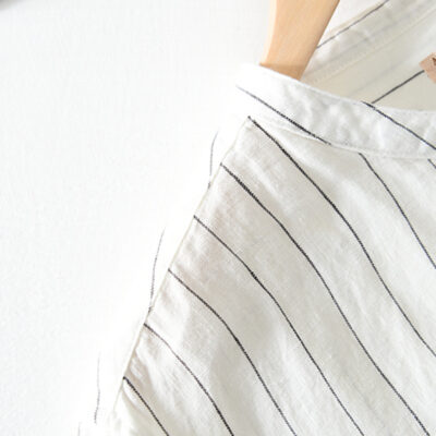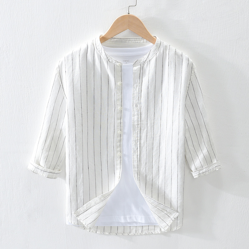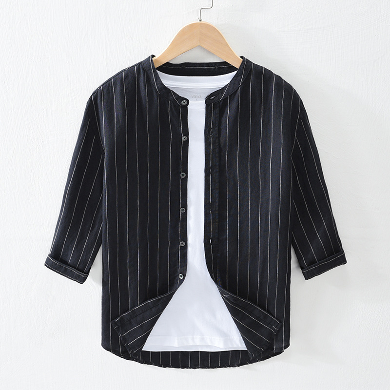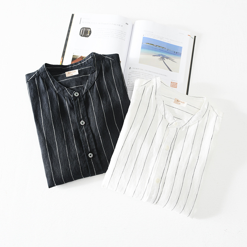 861 sợi nhuộm sọc cổ đứng bảy điểm giữa tay áo sơ mi vải lanh nam nhỏ giản dị tươi mát áo sơ mi cotton và vải lanh rộng rãi
