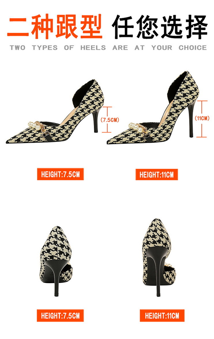 8829-1 phiên bản Hàn Quốc của giày cao gót kẻ sọc miệng nông bên rỗng dây chuyền kim loại chuỗi ngọc trai chuỗi rỗng giày siêu cao gót