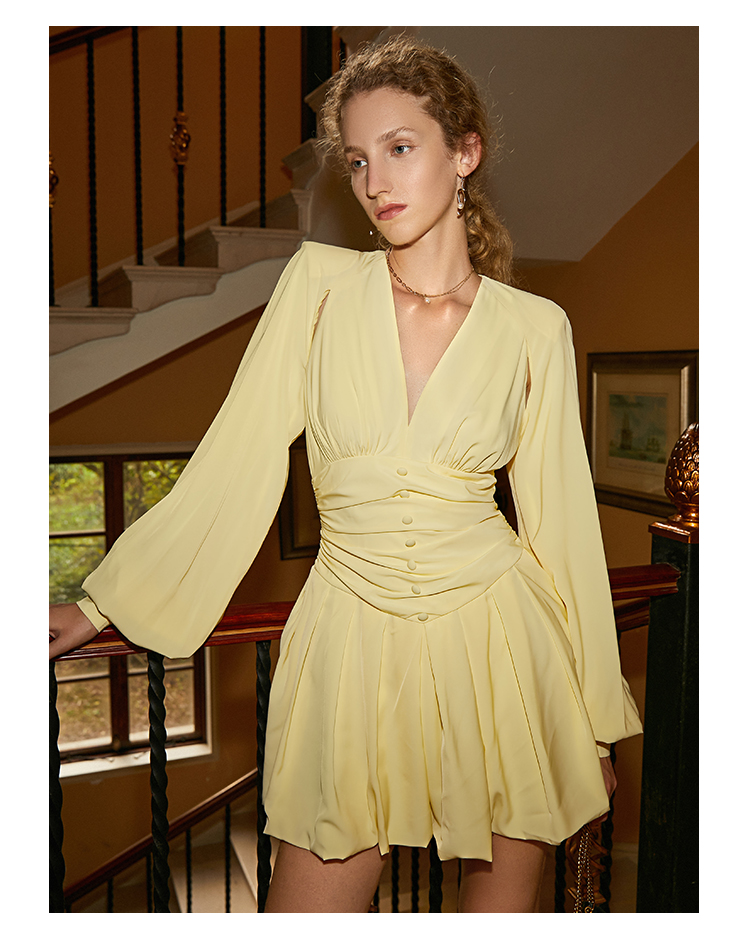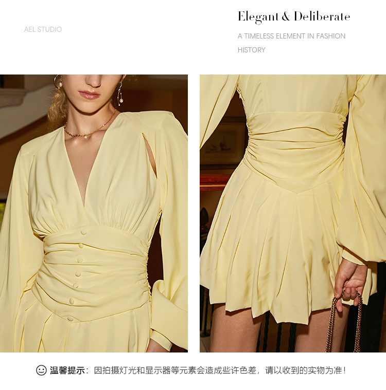 AEL nguyên bản cổ V gợn sóng cổ điển Pháp váy phụ nữ 2022 mùa xuân và mùa hè váy thắt lưng xếp ly mới