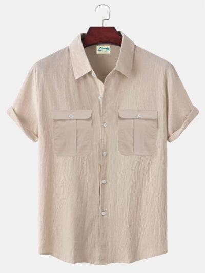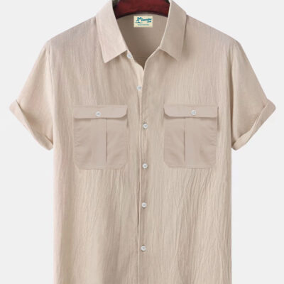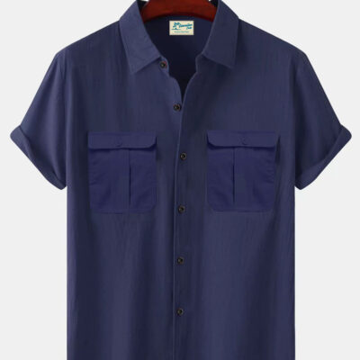 Amazon Mùa Hè Mới Áo Sơ Mi Đơn Giản Nam Màu Cắt Dán Vải Lanh Cardigan Nữ Tay Ngắn Lưng Áo Sơ Mi Nam