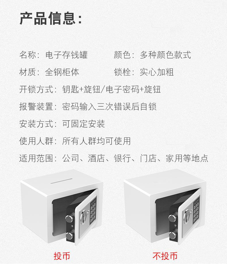 Sản phẩm nổi bật với các tính năng: An toàn cho trẻ em tại nhà văn phòng tại nhà an toàn báo động nhỏ mini mật khẩu hộp heo đất trưởng thành. Quý khách có nhu cầu mua Két sắt nhập khẩu vui lòng liên hệ với chúng tôi để được tư vấn hỗ trợ. Dịch vụ mua hàng Trung Quốc sẽ hỗ trợ quý khách mua hàng từ nhà cung cấp và giao tới tận tay quý khách hàng..