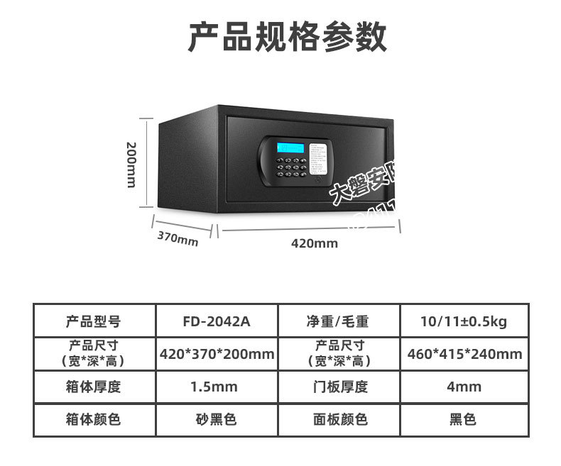 Trọng lượng: 10kg Mã sản phẩm: 2042A Thương hiệu: DAPAN/Dapan Chức năng báo động: Hữu ích: Khách sạn/Nhà khách Chất liệu: Tấm cán nguội Model: FD-2042A Thông số kỹ thuật: 2042 Kích thước: 420*370*200mm Tính năng chức năng: Loại chống trộm: Điện tử mật khẩu an toàn