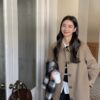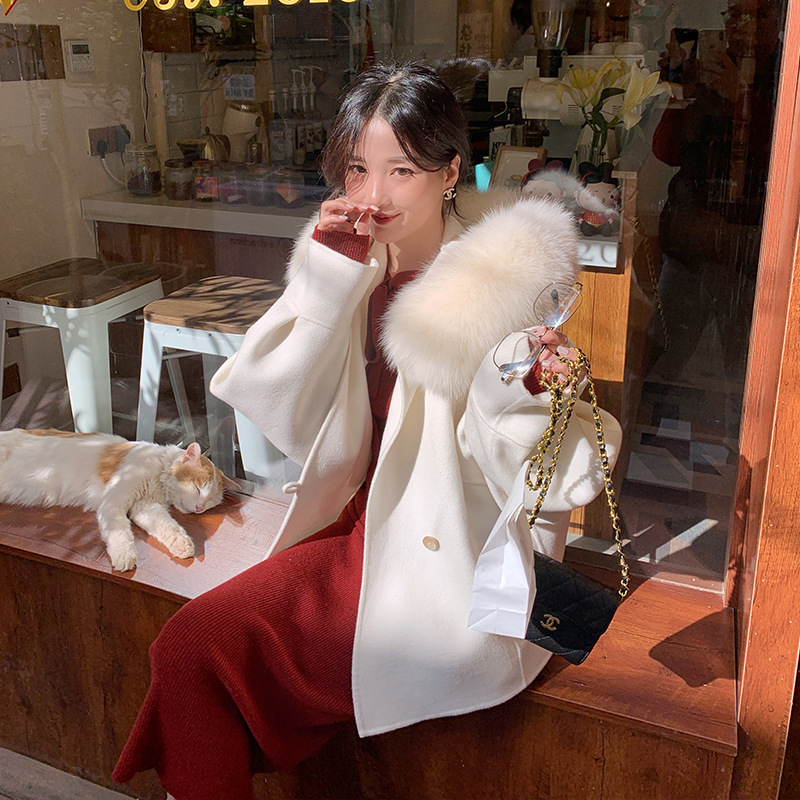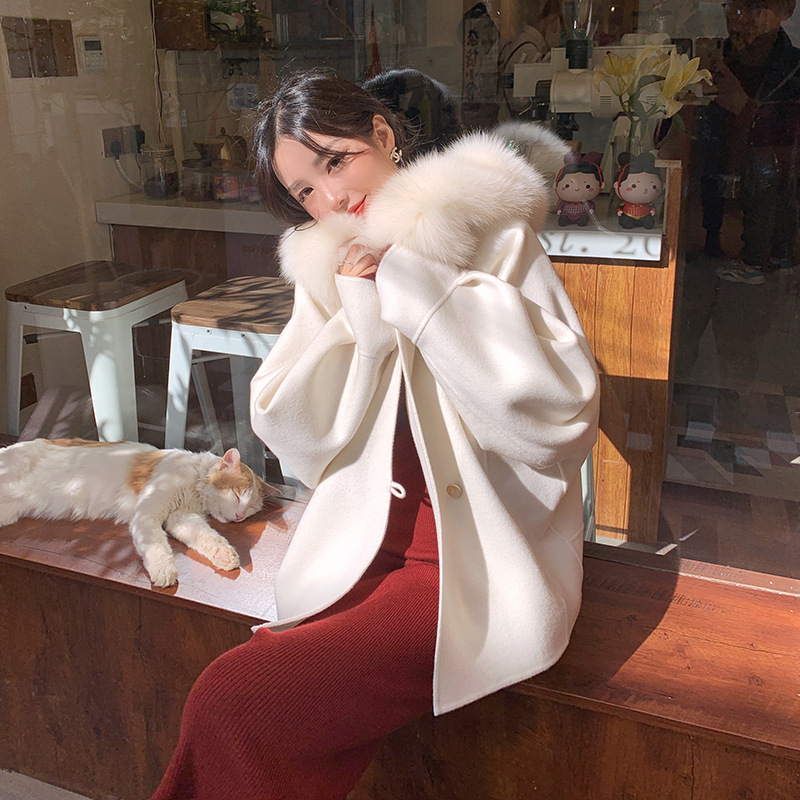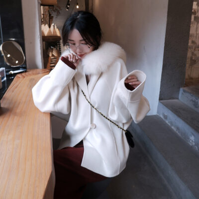 “Anfiona” Thu Đông Áo Khoác Len Cổ Lông Cáo Nhỏ Màu Trắng Ngắn Có Mũ Áo Khoác Len