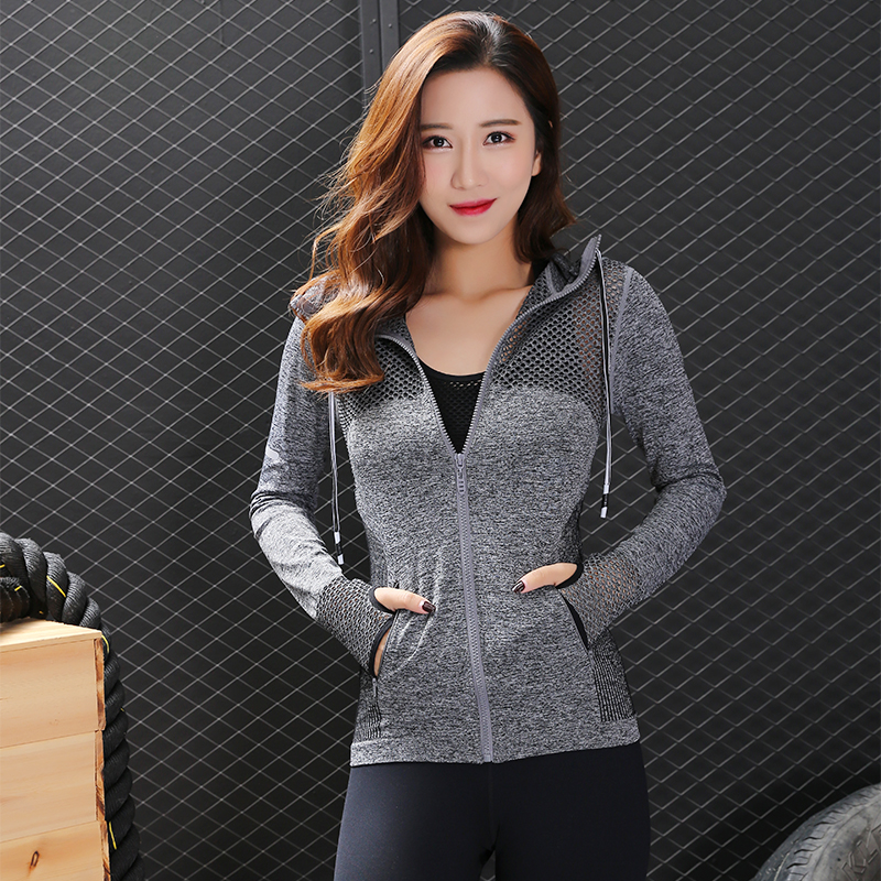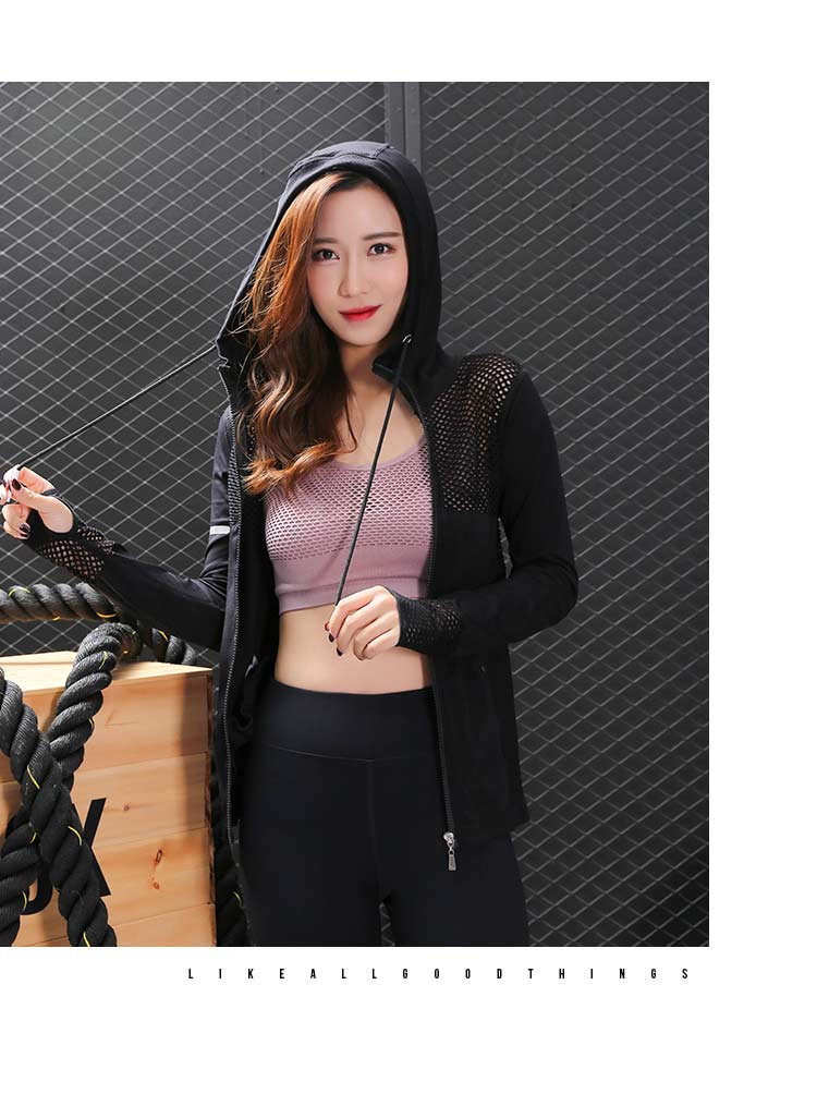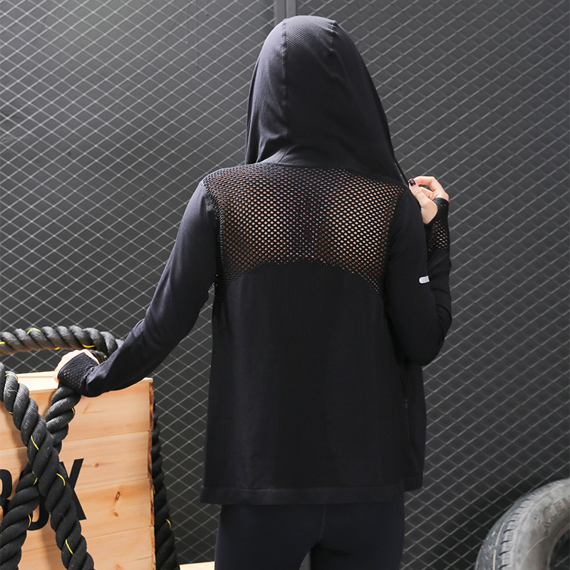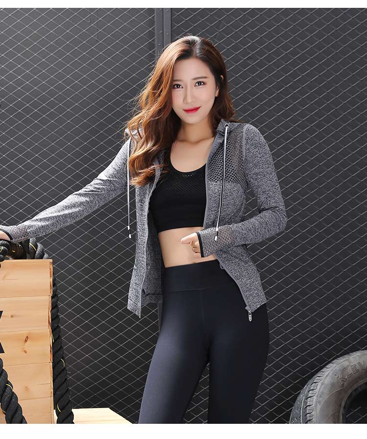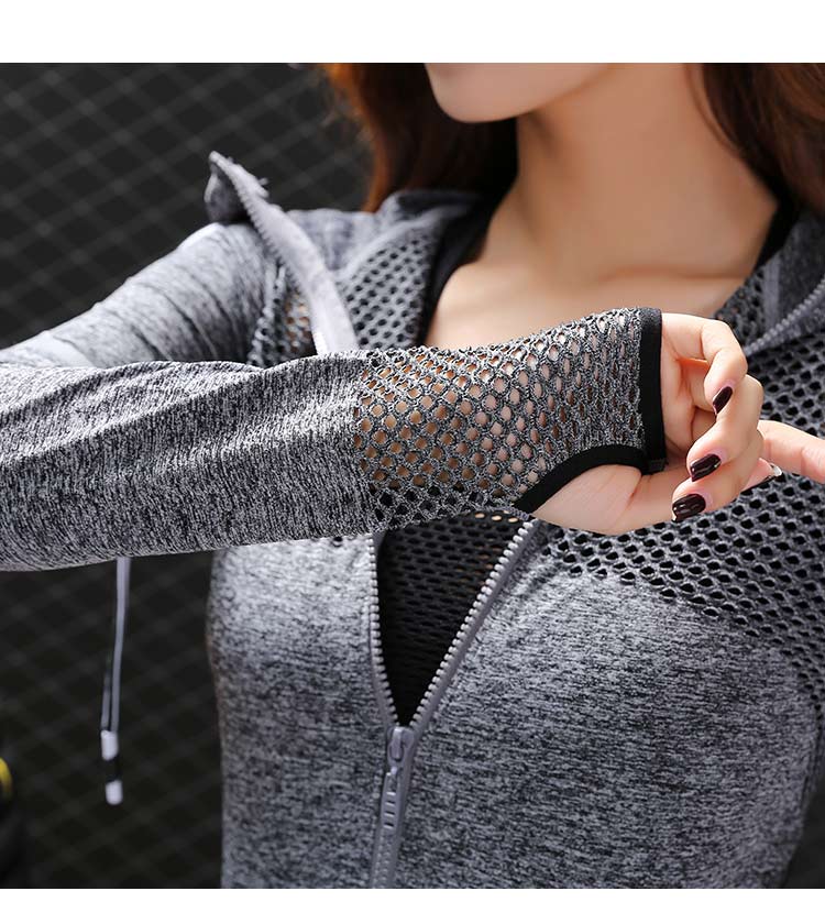 Ảnh đẹp đi chơi thể thao lưới khâu áo khoác thể thao có mũ trùm đầu Áo khoác mỏng giảm béo giản dị Áo khoác yoga thể dục tay dài