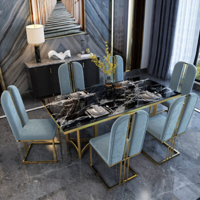 Ánh sáng Bắc Âu sang trọng bàn ăn bằng đá cẩm thạch và ghế kết hợp phòng khách tối giản hậu hiện đại bàn ăn hình chữ nhật nhà hàng bàn ăn cao cấp