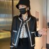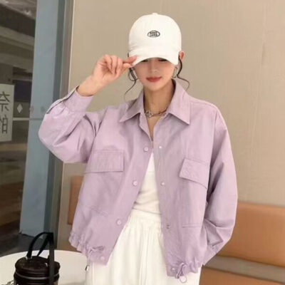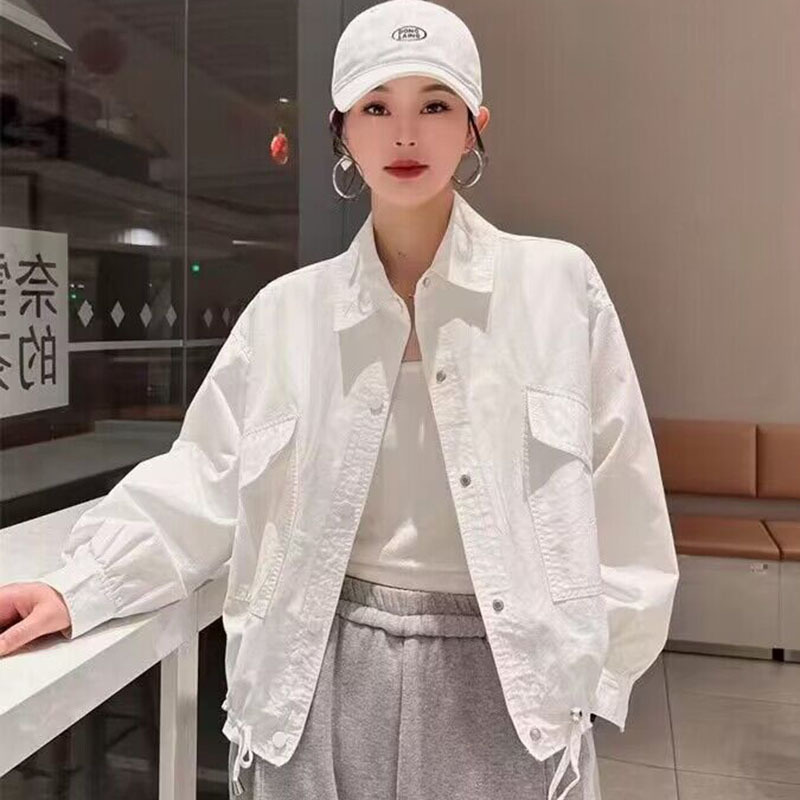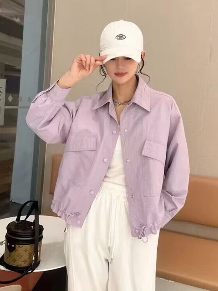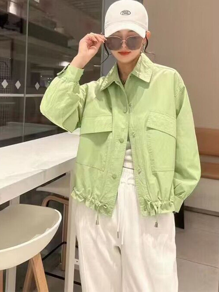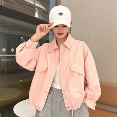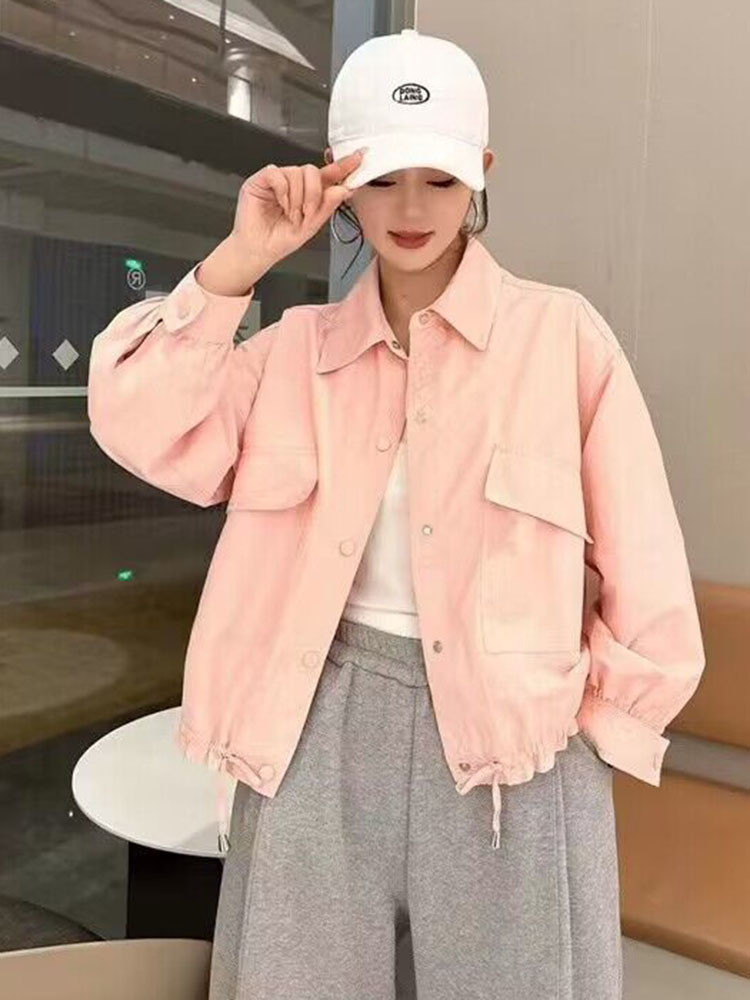 Áo khoác bóng chày ngắn nữ mùa xuân 2023 mới phù hợp với tất cả các trận đấu viền dây rút một bên ngực rộng áo khoác mỏng hợp thời trang