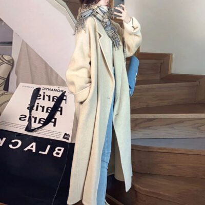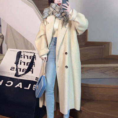 Áo khoác bột yến mạch áo khoác mùa thu đông 2022 áo khoác len hai hàng ngực mới áo khoác len nữ dài quá đầu gối áo khoác