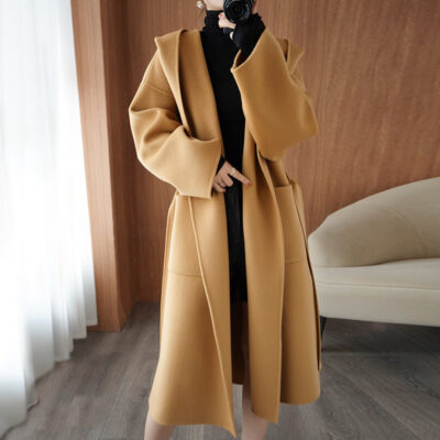 Áo khoác cashmere hai mặt có mũ trùm đầu dài vừa phải cho nữ mùa thu đông kiểu mới buộc lỏng lẻo Áo khoác len toàn len
