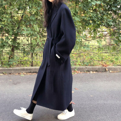 Áo khoác cashmere hai mặt màu ca cao Dongdaemun Hàn Quốc thắt lưng dài vừa phải áo khoác gió nylon hai mặt may thủ công
