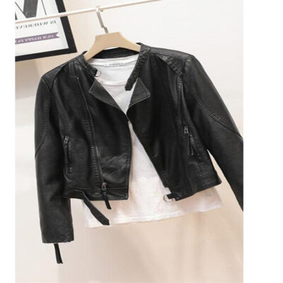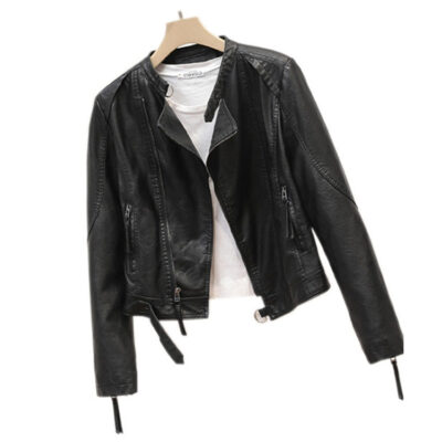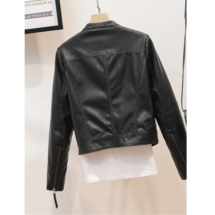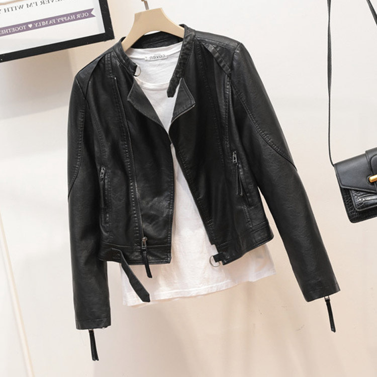 Áo khoác da màu đen kiểu Hàn Quốc dành cho nữ mùa xuân và mùa thu mới phần mỏng ôm vừa vặn cổ ngắn áo khoác xe máy thủy triều