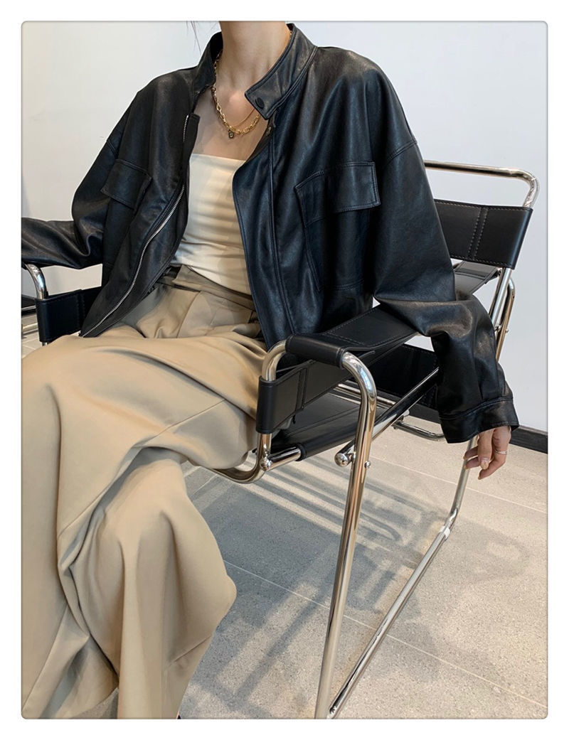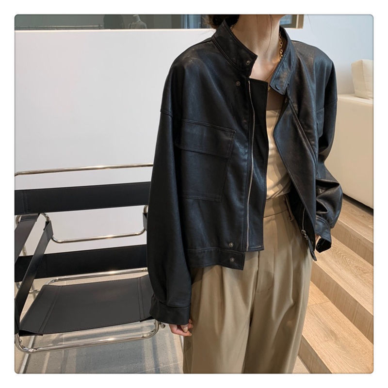 Áo khoác da mùa xuân và mùa thu phiên bản mới của Hàn Quốc cổ đứng đẹp trai Áo khoác PU túi đầu máy chất lượng tốt thế hệ nữ ngắn