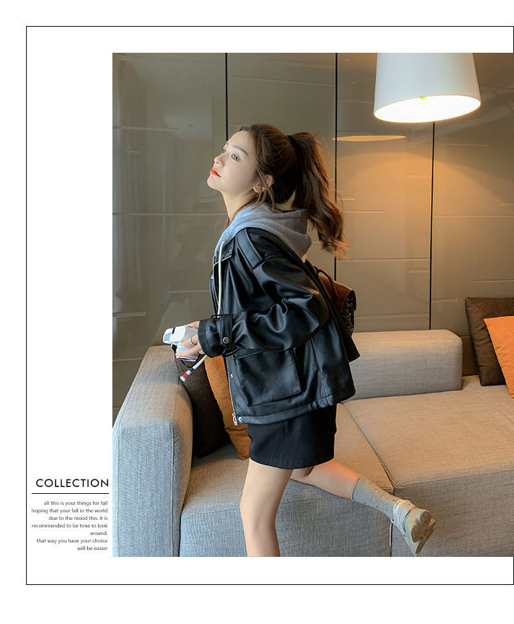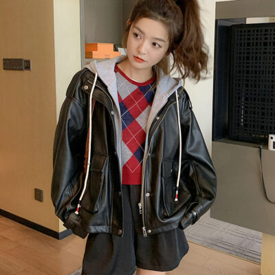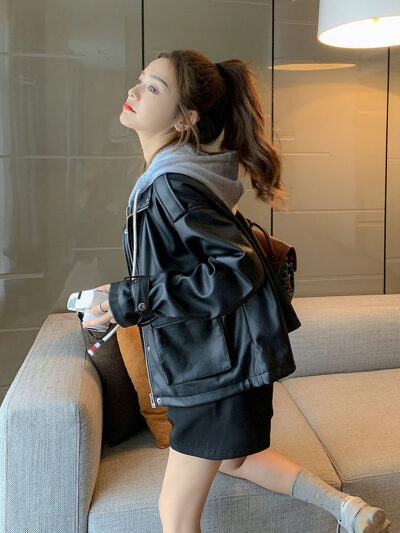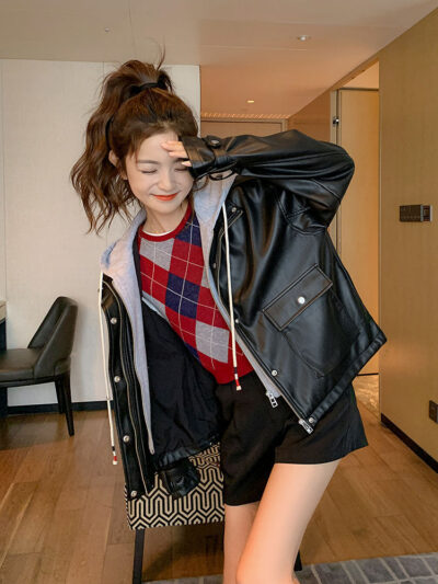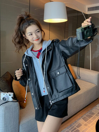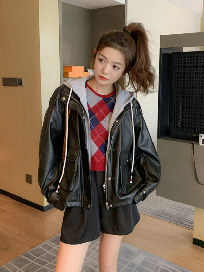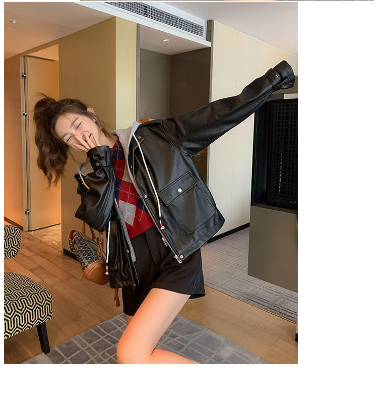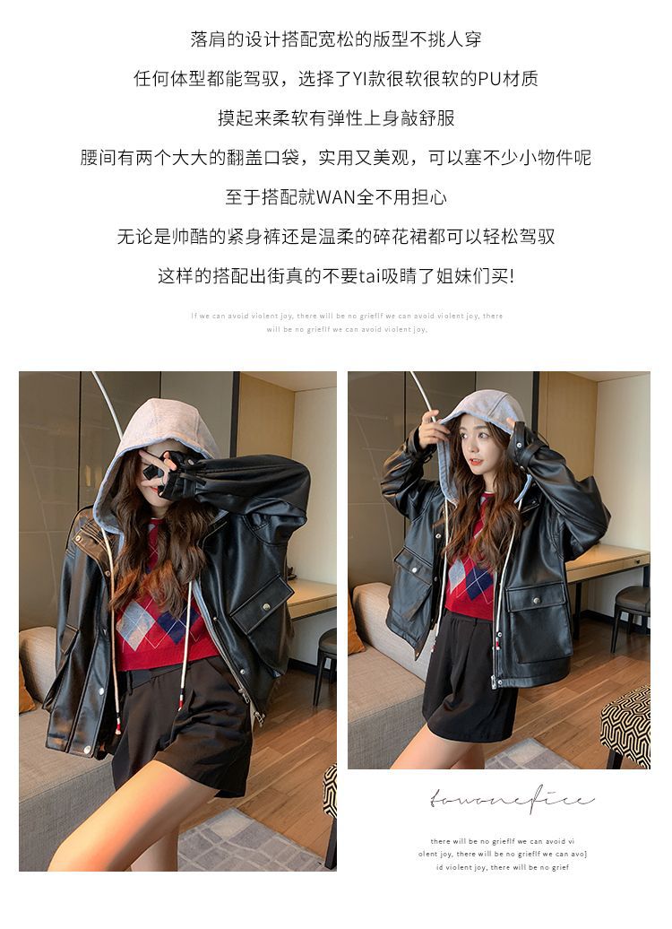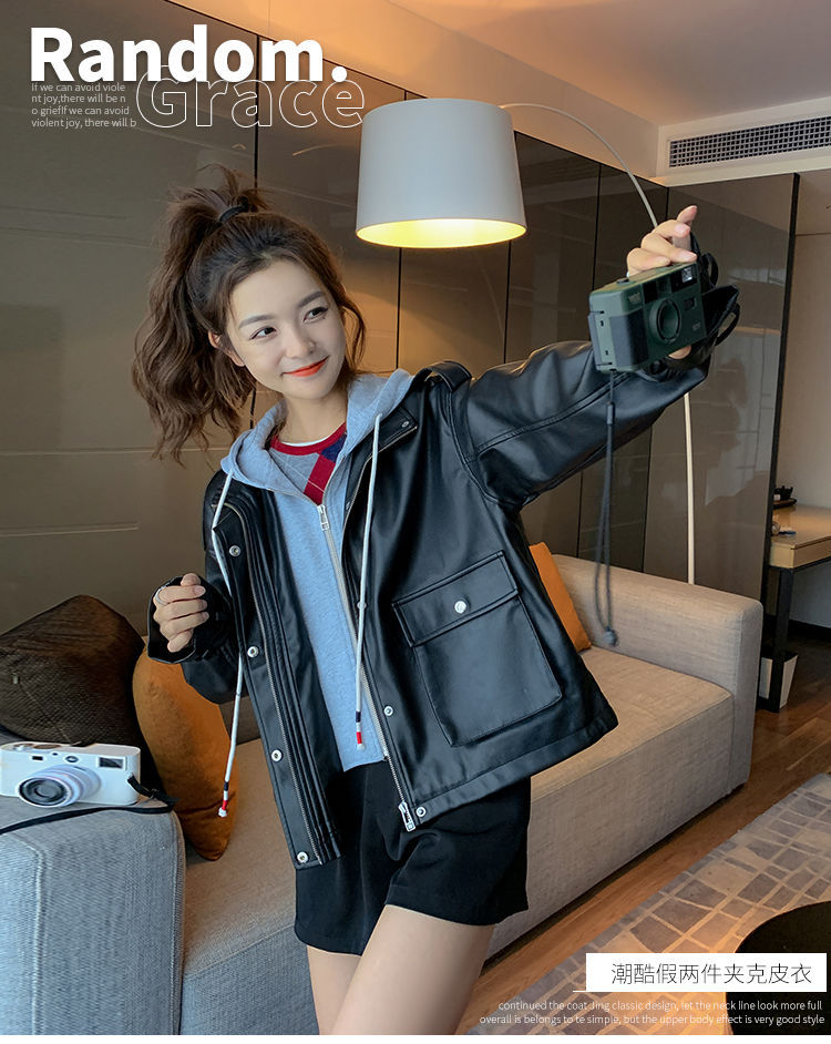 Áo khoác da nữ mùa xuân 2023 mới giả 2 mảnh có mũ trùm đầu có thể tháo rời ngắn phù hợp với xe máy áo khoác da nhỏ
