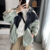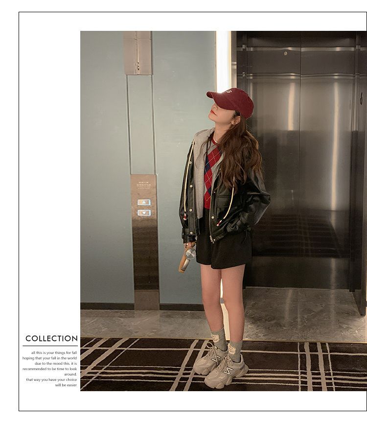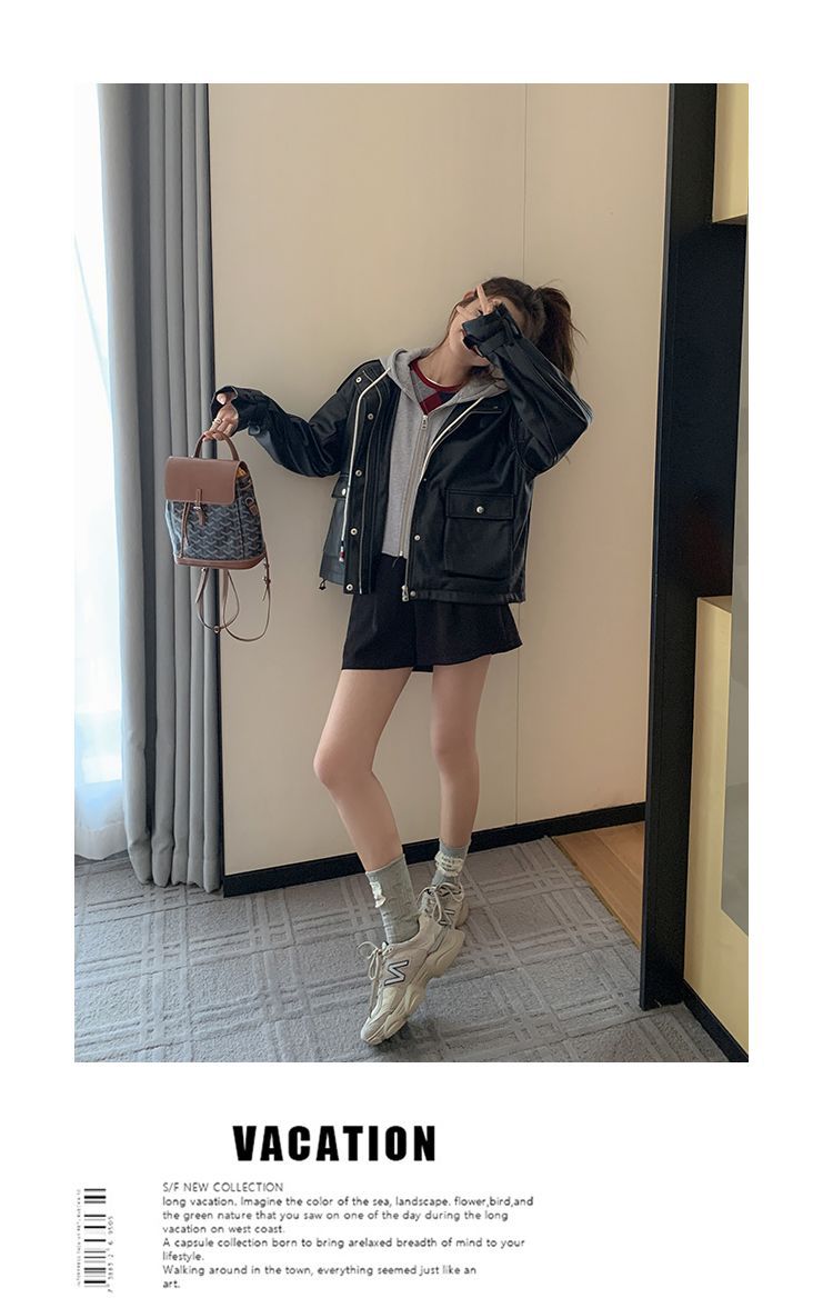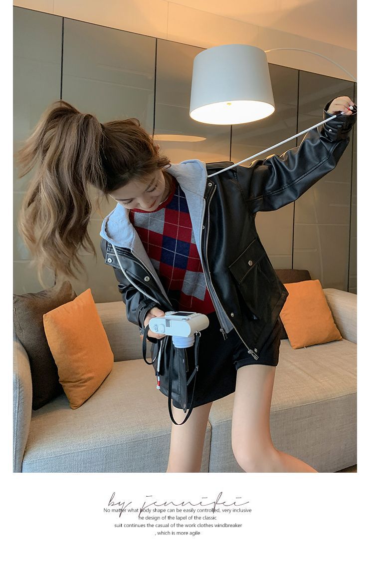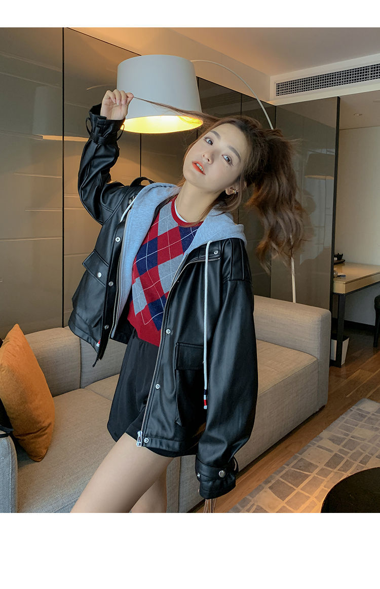 Áo khoác da nữ mùa xuân 2023 mới giả 2 mảnh có mũ trùm đầu có thể tháo rời ngắn phù hợp với xe máy áo khoác da nhỏ