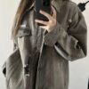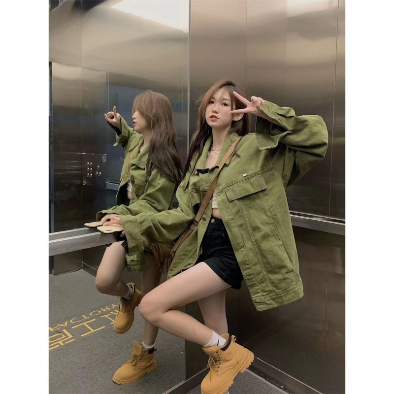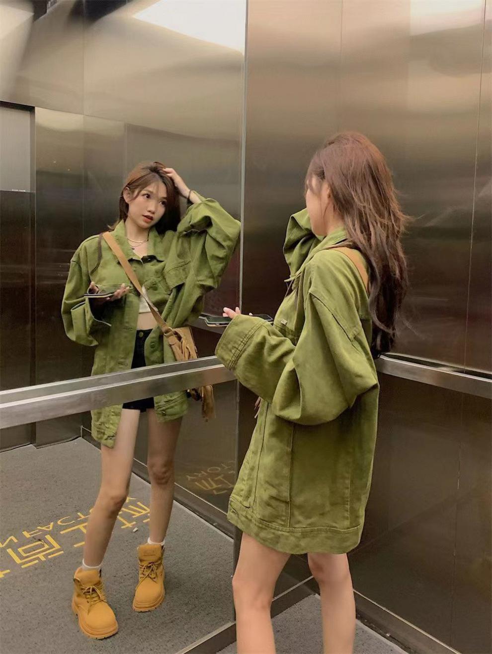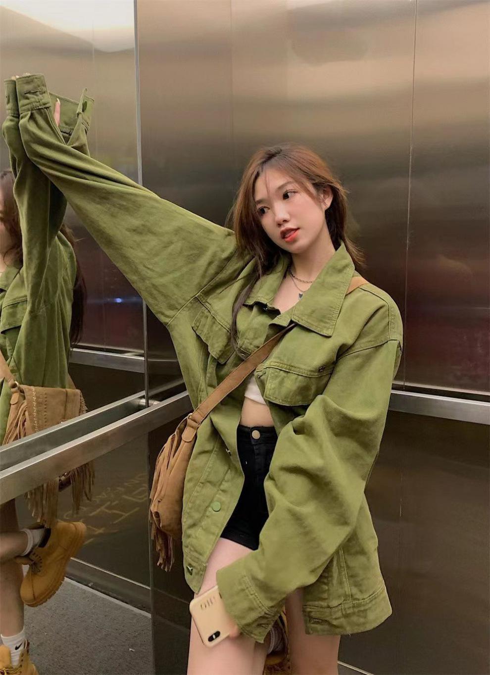 Áo khoác denim màu xanh lá cây theo phong cách Hồng Kông của Mỹ, áo khoác denim nữ đầu mùa thu rộng thời trang thường ngày phù hợp với tất cả các trận đấu dài tay hàng đầu