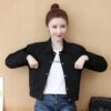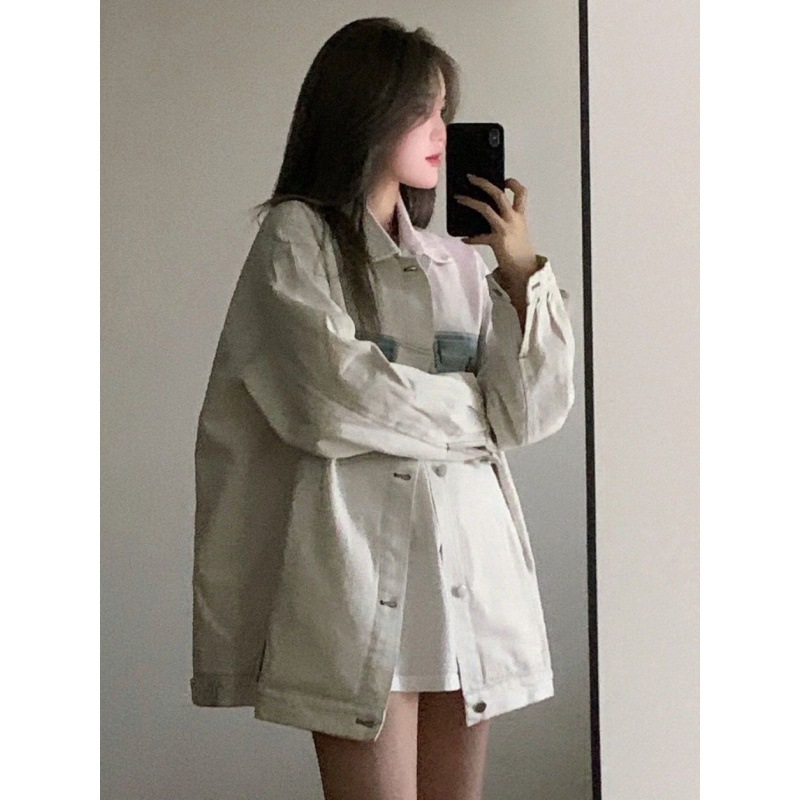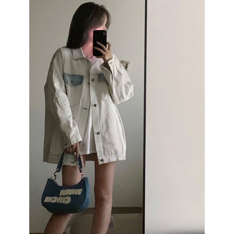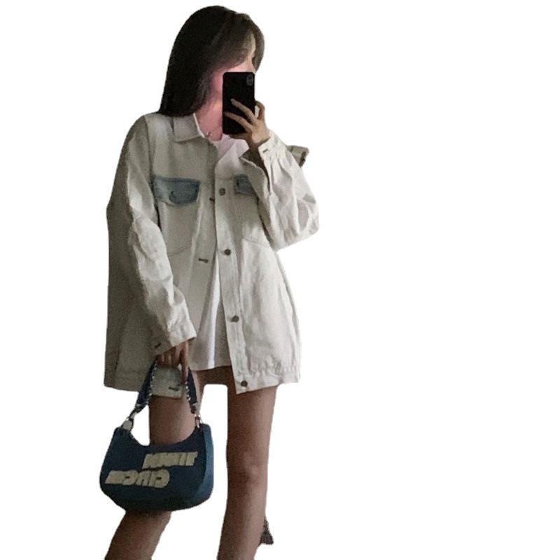 Áo khoác denim phong cách Âu Mỹ cho nữ mùa thu mới kiểu Hàn Quốc nối và màu tương phản áo khoác dụng cụ giảm béo hàng đầu