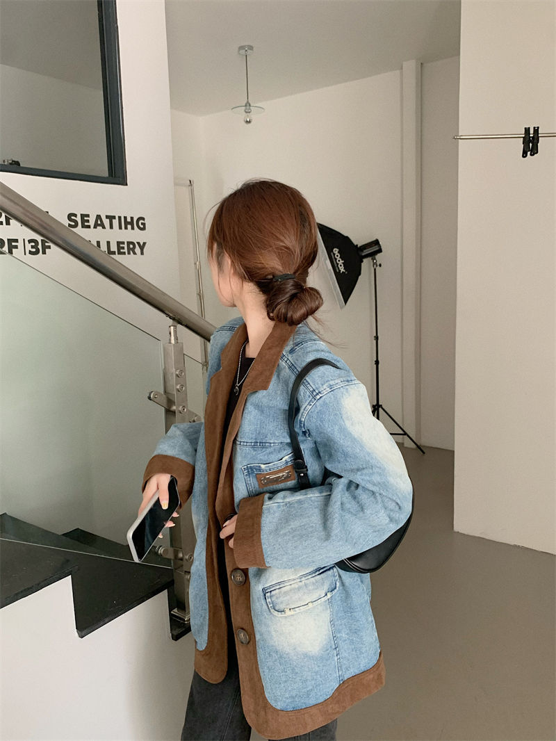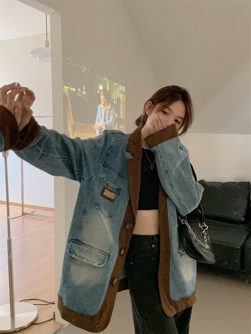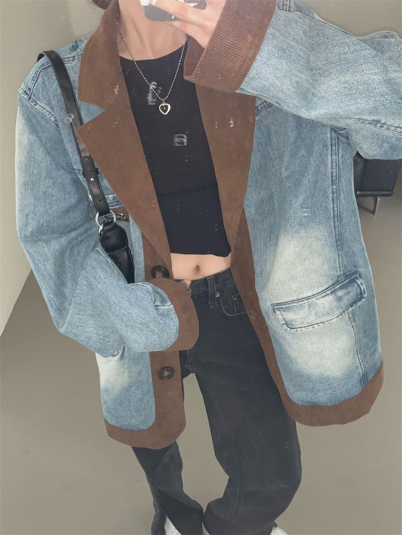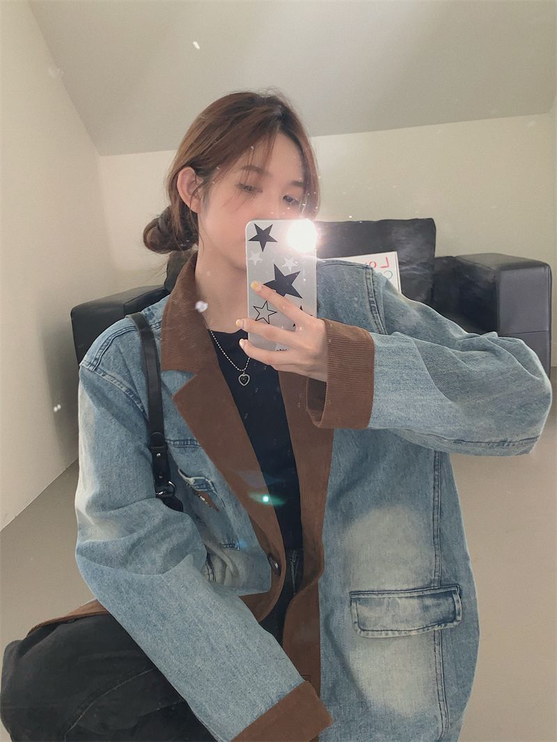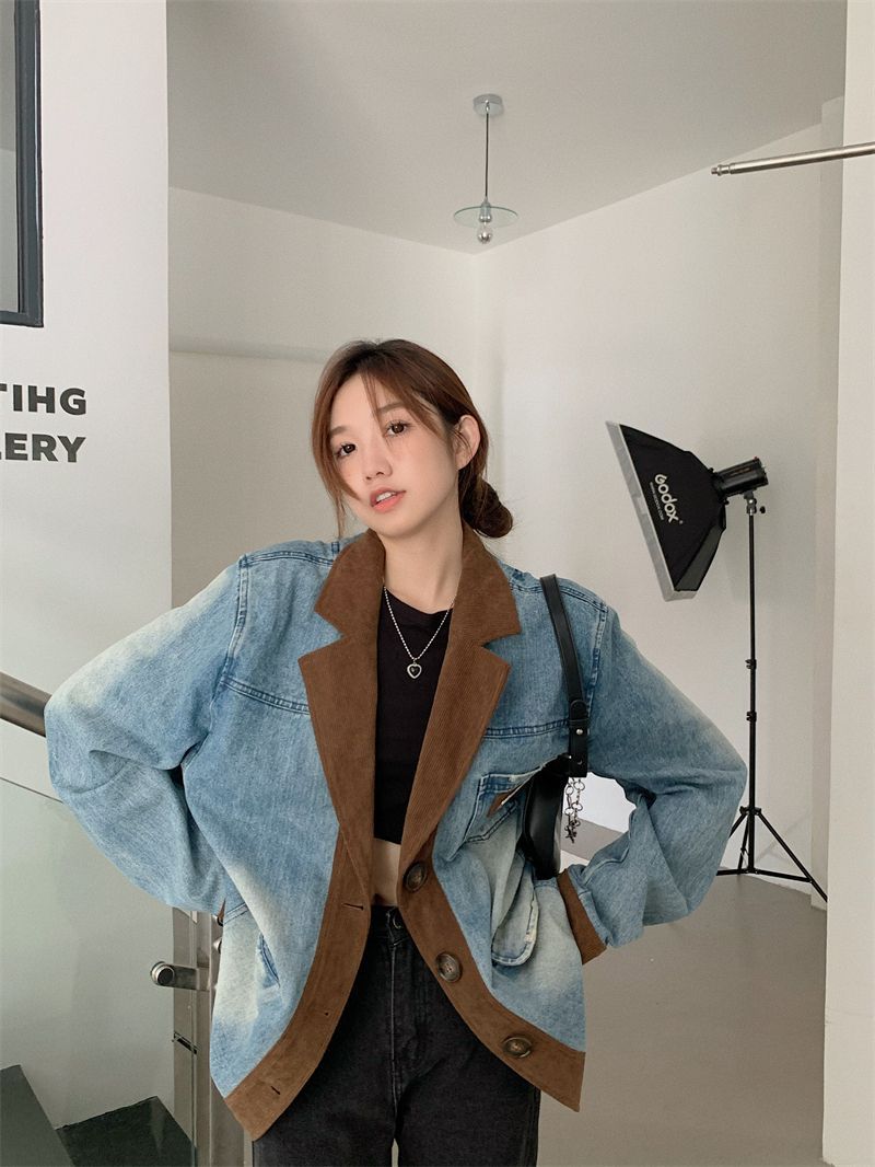 Áo khoác denim phù hợp với áo khoác mùa xuân của phụ nữ Hồng Kông phong cách retro tất cả các trận đấu khâu thiết kế cảm giác thích hợp phù hợp với áo khoác